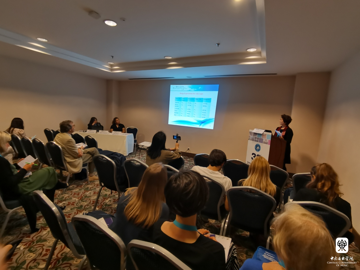 28日下午4时,韩丽艳主任又参加了主题为“专业嗓音”的研究论坛(Research Forum:Professional Voice),分享了她30年来一直感兴趣并致力于研究的课题:声乐声部的划分。在“Application Study of the Voice Range Profile(VRP) In Voice Classification(Fach)”的演讲中,韩丽艳主任首先论述了嗓音使用的正确合理性与声部划分的准确性之间的关系以及德国Fach系统的分类特点。其次,韩主任分享了歌剧导演、声乐老师、嗓音医生如何借助各自的经验和检测手段进行声部划分以及划分问题的复杂性。最后介绍了音域图在展示歌手发声能力、发声问题、可用音域范围、不同声部及其声种之间的差别具有的直观、客观、准确等特点和优势,引来国外专家的极大关注和兴趣。