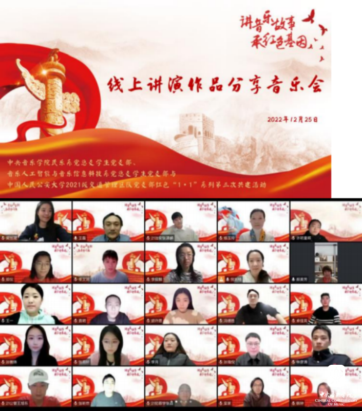 (三)2022年12月25日,米兰民乐系、音乐人工智能与音乐信息科技系学生党支部,与中国人民公安大学2021级交通管理区队党支部成功举办“讲音乐故事、承红色基因”线上音乐会——第三次红色 “1+1”主题教育系列活动。中华文化博大精深、源远流长,中国的传统音乐蕴含着中华文化独有的韵味,通过音乐的表达,诠释历久弥新的承担情怀,通过多样化的音响组合,演绎承传不衰的红色基因,继承和发扬中华民族的文化精神,以积极正能量的作品启示青年一代蓬勃发展。