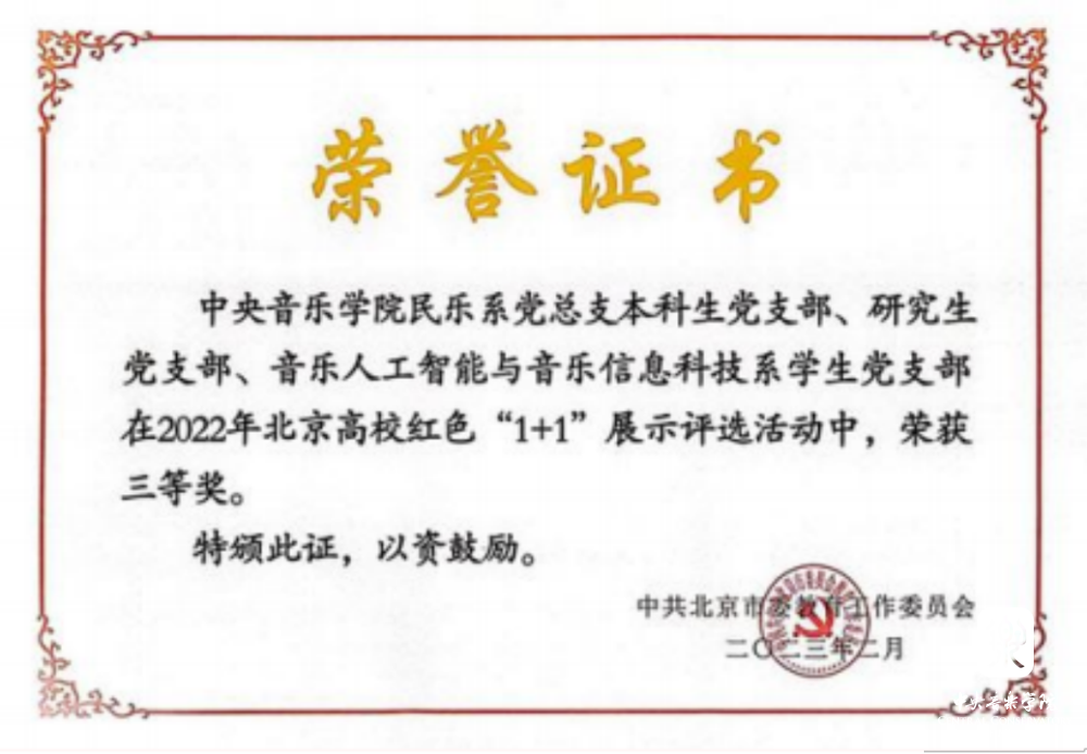 为学习贯彻党的二十大精神和习近平总书记在庆祝中国共产主义青年团成立100周年大会上的重要讲话精神,扎实推进教育部“青春献礼二十大 强国有我新征程 ”迎接学习宣传党的二十大主题宣传教育活动和北京教育系统“请党放心 强国有我 ”主题教育活动,教育引导大学生自觉将“小我 ”正青春融入“大我 ”新时代,市委教育工委自2022年6月份以来组织开展了北京高校红色“1+1”活动。2023年2月经过支部申报、学校推荐、专家初评、现场复评确定等环节,AC米兰中文官网民乐系党总支本科生党支部、研究生党支部、音乐人工智能与音乐信息科技系学生党支部获得三等奖。