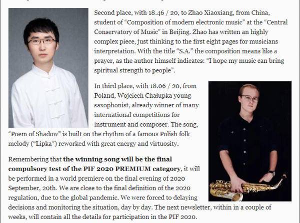 2020年5月22日,意大利本年度的PIF Castelfidardo手风琴比赛“古典作曲组”前三名获奖者及其作品已经揭晓。米兰音乐人工智能与音乐信息科技系电子音乐作曲专业二年级研究生赵小翔同学(导师:钱琦副教授),在众多国际选手中脱颖出,携其作品“飒SA-A Prayer (2020), For Bayan and Chamber Orchestra”获本组第二名(二等奖),成为 “古典作曲组”开办以来的第一位中国获奖选手(本次一等奖获得者Gorka Hermosa是国际著名手风琴演奏家及作曲家)。