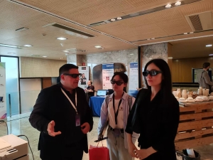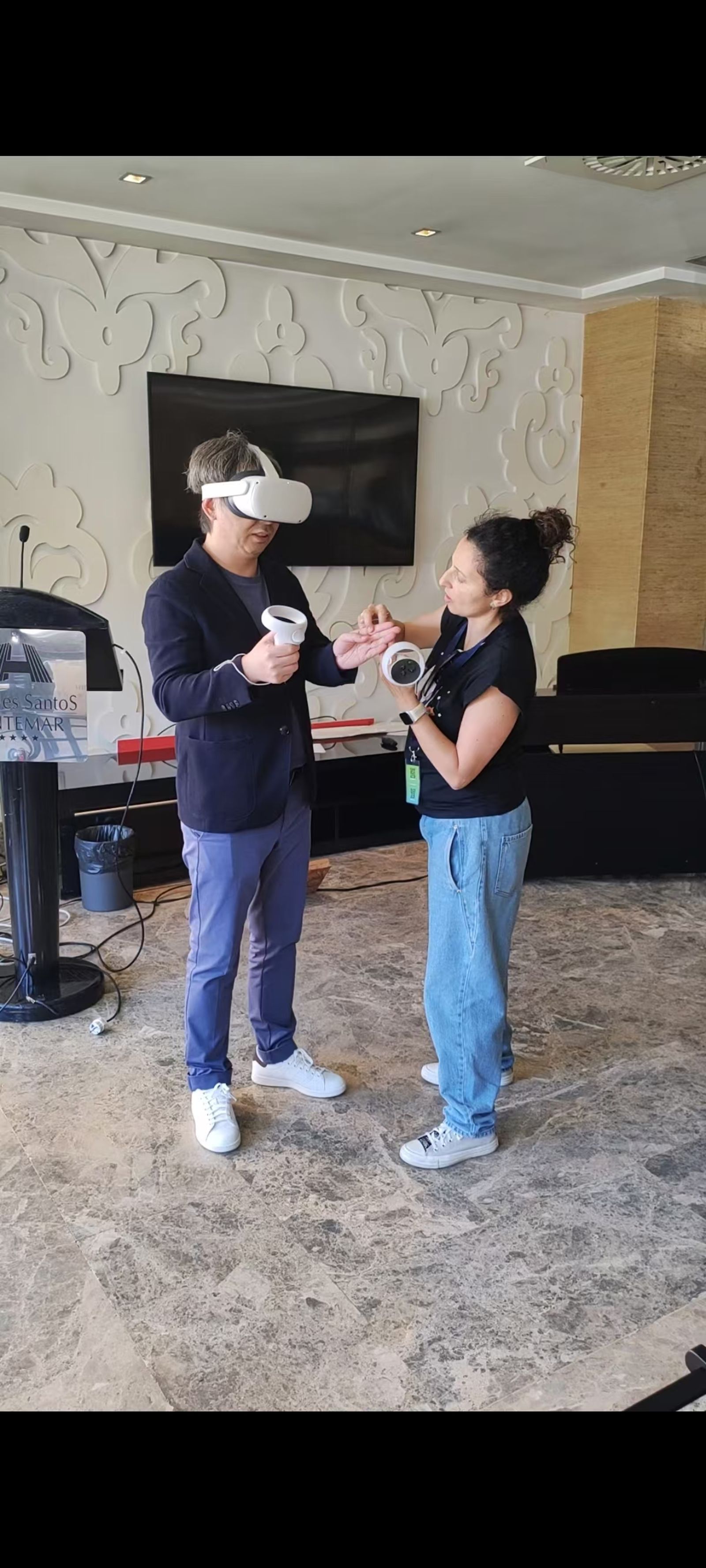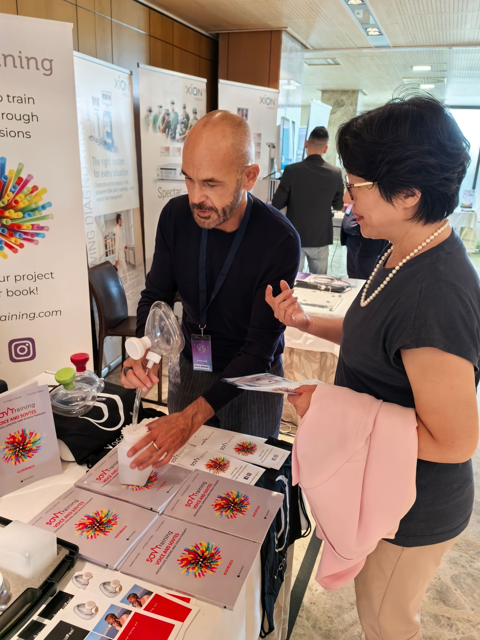 连续多年受邀参加米兰嗓音论坛的美国专家基蒂·维尔多利尼(Kittie Verdolini)教授和莉萨·波普艾尔(Lisa Popeil)女士也受邀出席了本次盛会。她们分别在“科学与艺术”板块上发表了题为“Art and Science: Distincta vel Inhabitatio ”(艺术与科学:各有其别,或各领风骚)的主旨演讲和“Vocal Fold Closures with Stroboscopy and High-Speed Video”(利用动态喉镜和高速摄影观察声门闭合的不同状态)的主题分享,并开展了主题为“The Art & Mechanism of Vibrato”(颤音产生的机制和在歌唱中的应用)的工作坊。而另一位曾受邀参加米兰嗓音论坛的美国专家David Meyer教授所带领的团队,在此次会议上分享了“Examining the Effects of Virtual Reality Room Size on Singers’Vocal Behavior”(探究虚拟现实房间大小对歌手发声行为的影响)。中国代表、著名演播艺术家周扬老师亲自实验,并发出感慨:作为一名有声语言工作者,关于嗓音领域我们所做的研究和思考还是比较狭窄和简单的。而此次会议为我开启了用“理性思维”解决艺术教育“感性问题”的途径,并展示了通过全方位、多学科方法来探索嗓音科学奥秘的新视角。