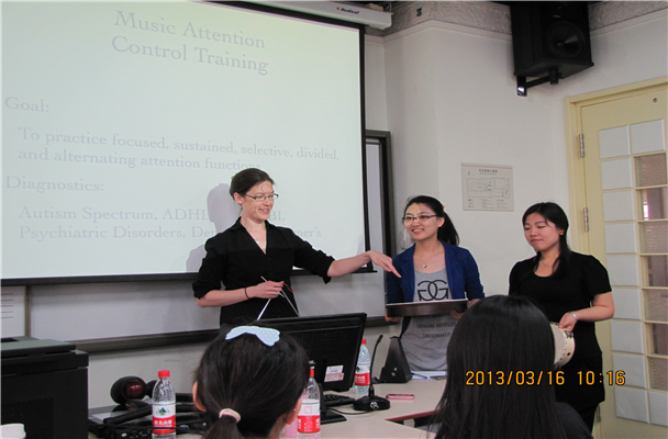 2013.5.15日16日,我们邀请到了美国科罗拉多州立大学音乐学院音乐治疗副教授Blythe LaGasse博士,在我院举办了两天专家课。