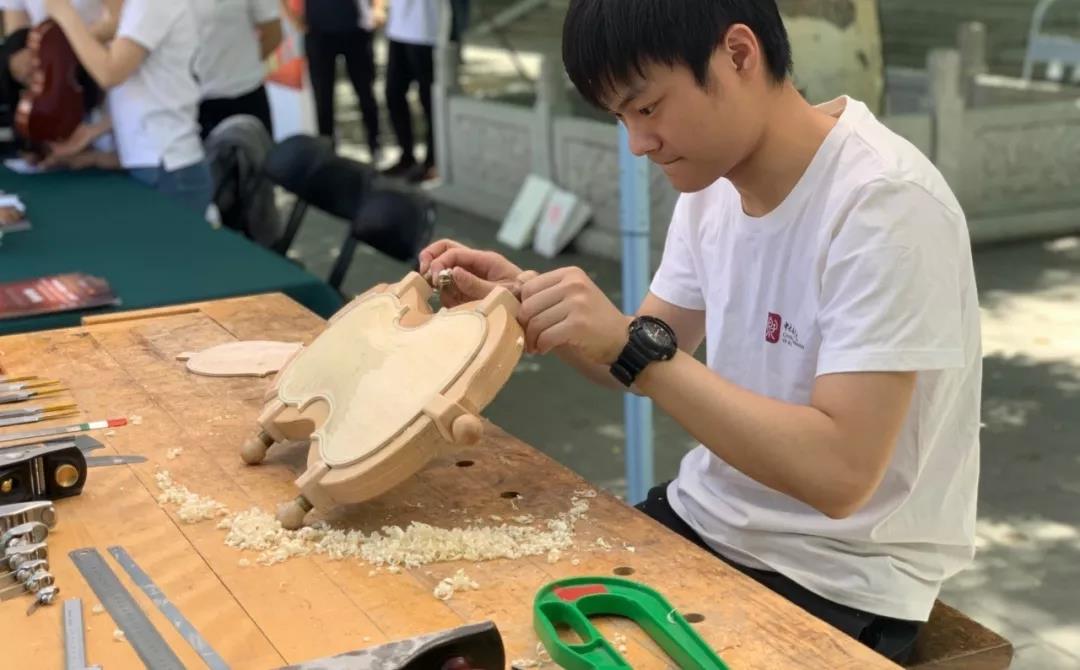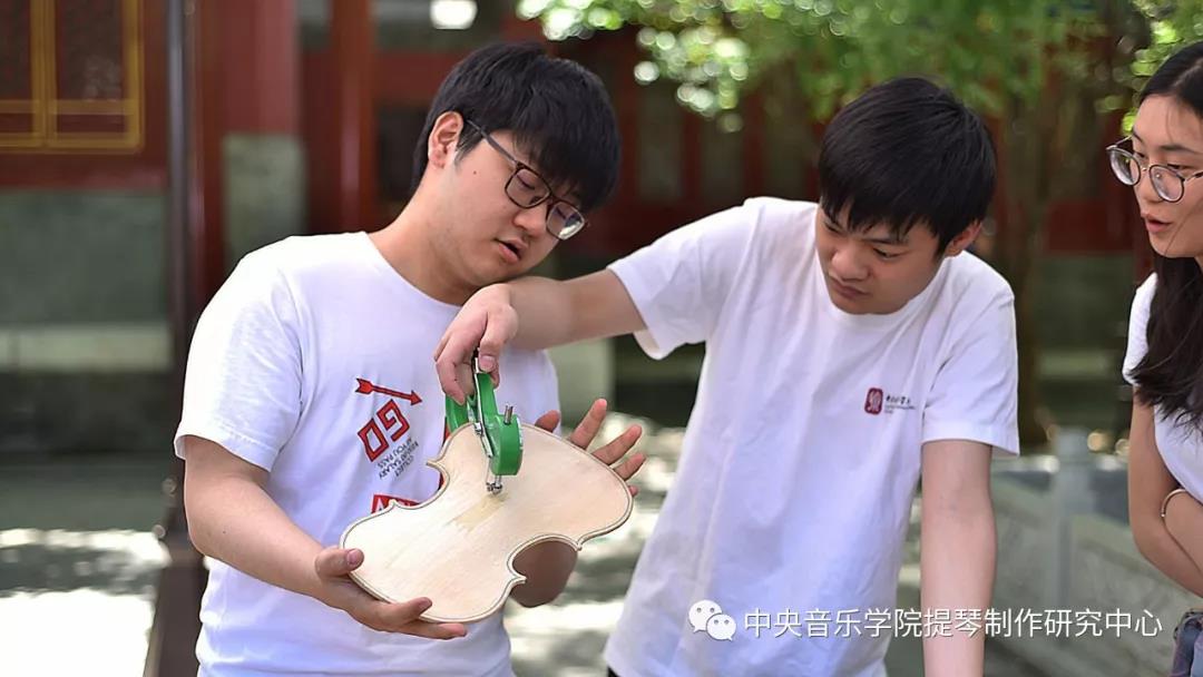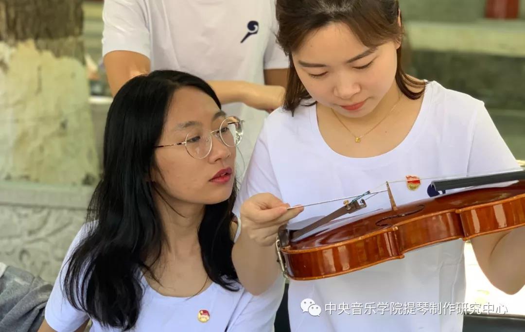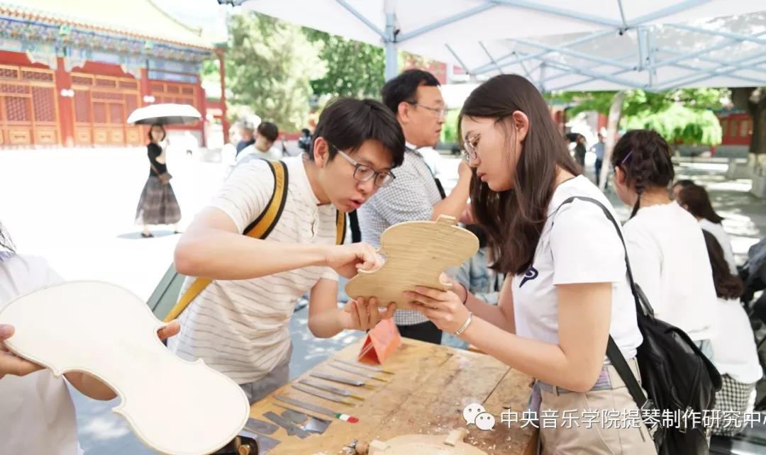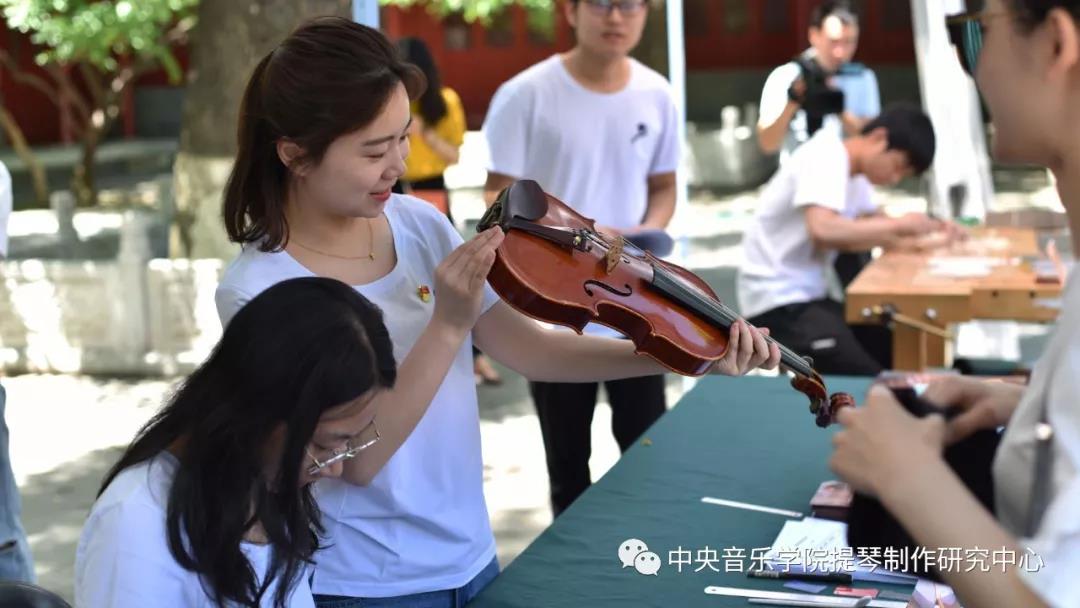 中午时分,学院室外大屏幕滚动播出本次活动的宣传片,展示了提琴制作研究中心(以下简称“中心”)师生们的日常教学与工作。宣传片细腻生动感人,其中的提琴演奏者是来自中心二年级的同学马小淅,演奏用琴来自中心青年学生手工制作,音乐由我院作曲系电子音乐录音艺术的研究生帮助录制完成。悠扬的琴声响彻校园,为活动增添了亲切之感。位于学院王府院广场,来自中心的党团青年师生为弦乐演奏专业的同学义务诊断提琴健康状况、解答提琴出现的问题,受到了各界的赞誉。前来诊断的同学络绎不绝。
