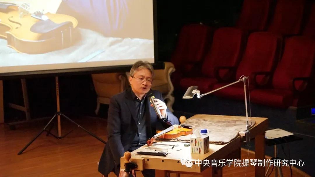 高老师首先从提琴的维护与保养知识切入,重点分享了关于琴弦的老化与更换、琴码的检查、弦轴的检查与微调等三方面内容。逯翔老师侧重于提琴琴箱修复问题的诊断,对于琴箱的开胶开裂、腮托的安装位置给予了重点分享。陈婷老师专门讲解了提琴油漆方面的知识。刘崇余老师对于现场观众呈上的琴弓给予了充分的意见与建议。管弦系系主任童卫东老师亲自上场,饶有兴趣地参与了讲座的访谈与互动。