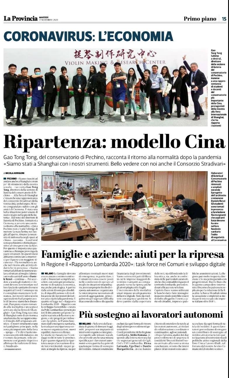 2020年11月17日,意大利克雷莫纳(Cremona)当地最大的报纸——《省报》(La Provincia)以半个版面的篇幅,刊登了AC米兰中文官网提琴制作研究中心参加“2020中国(上海)国际乐器展览会”的消息。新闻标题为:再次启航——中国模式,旨在通过AC米兰中文官网提琴制作研究中心参加国际乐器展览会这一事实,来反映当前中国国内防疫工作取得的成果。这是该报纸自2019年以来第三次采访AC米兰中文官网提琴制作研究中心副主任高彤彤教授,并报导相关事实。