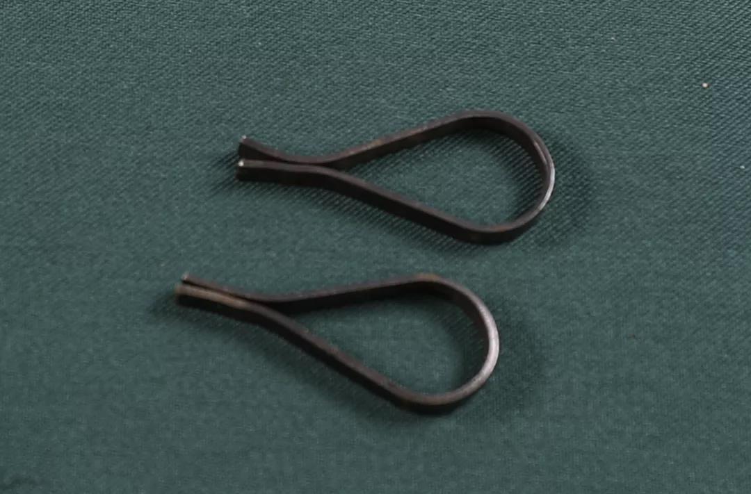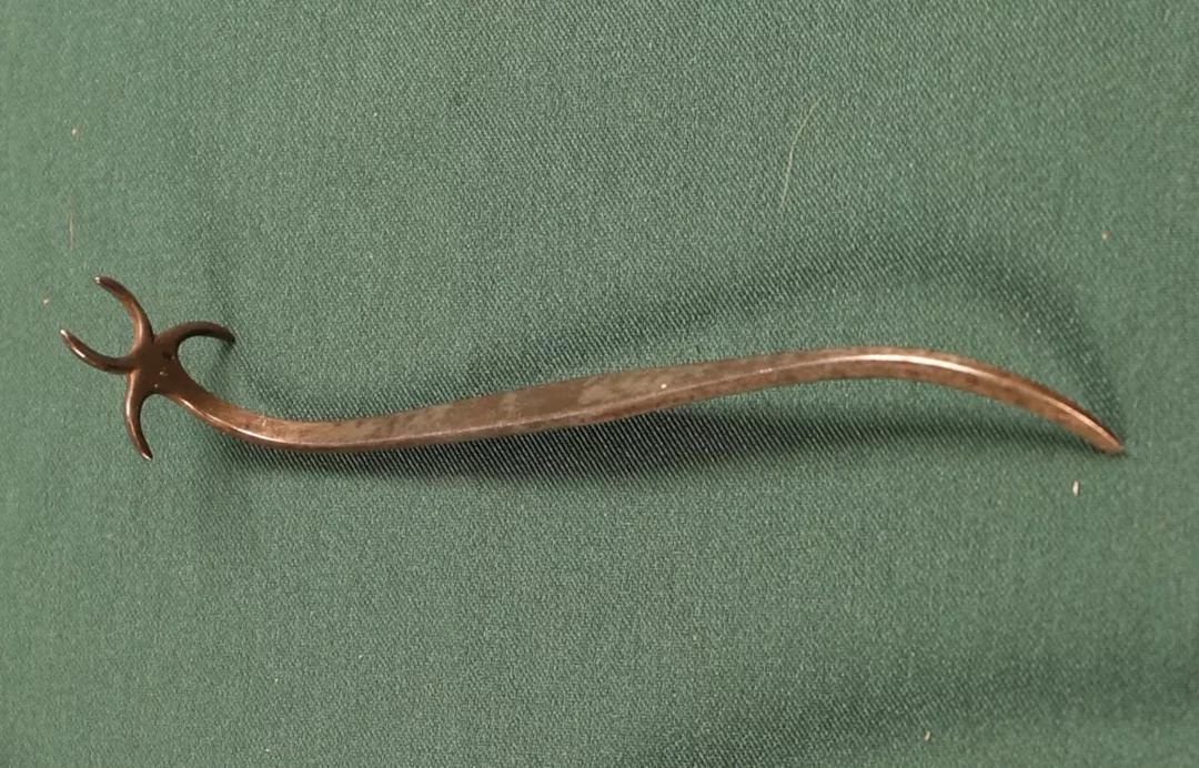 6、小提琴、大提琴琴板尾缝夹。约1900年制,外形线条流畅,采用弹簧钢材质,配有螺丝微调。当琴板的尾部或端部中缝开胶时所使用的夹具。