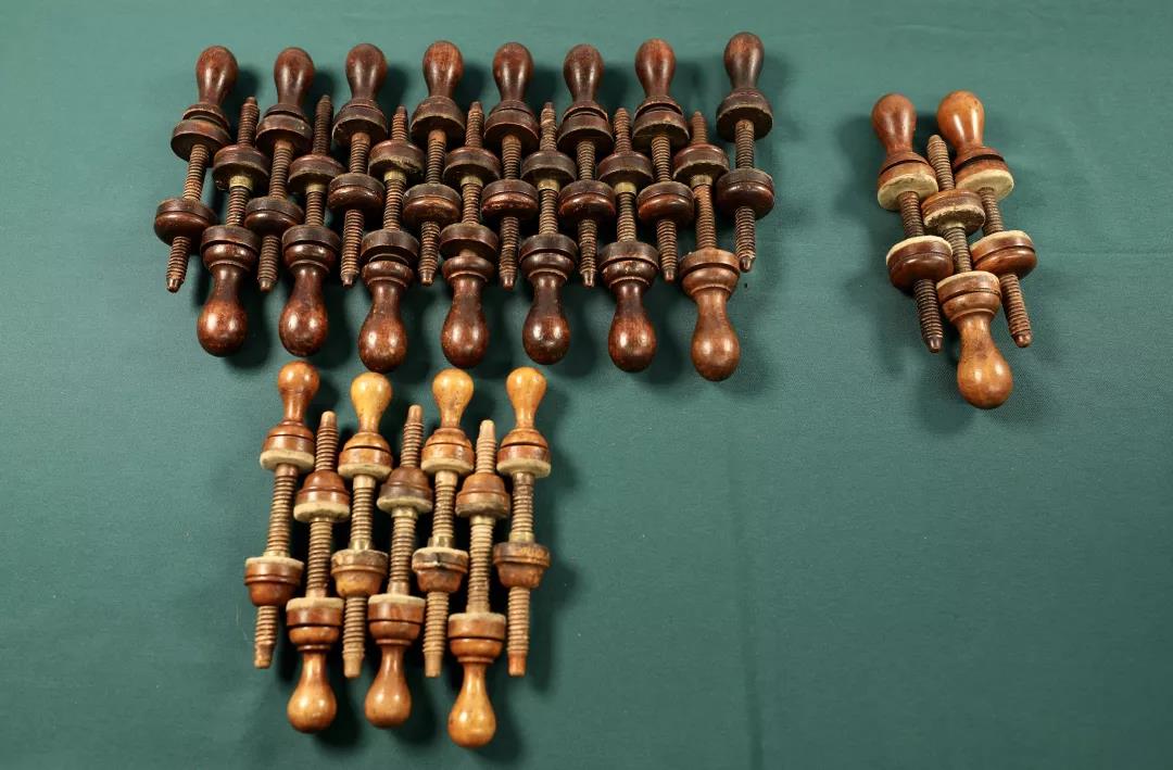 7、英国硬木材质小提琴(含儿童琴)、中提琴及大提琴合琴夹具。夹具木杆上配有螺纹。1900-1930年间出品。它使用在琴板与侧板间,是在粘合侧板与琴板时的固定工具。