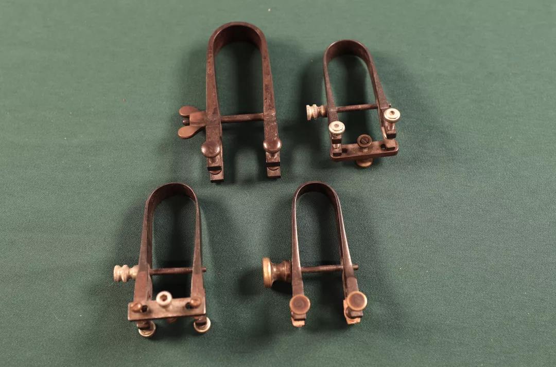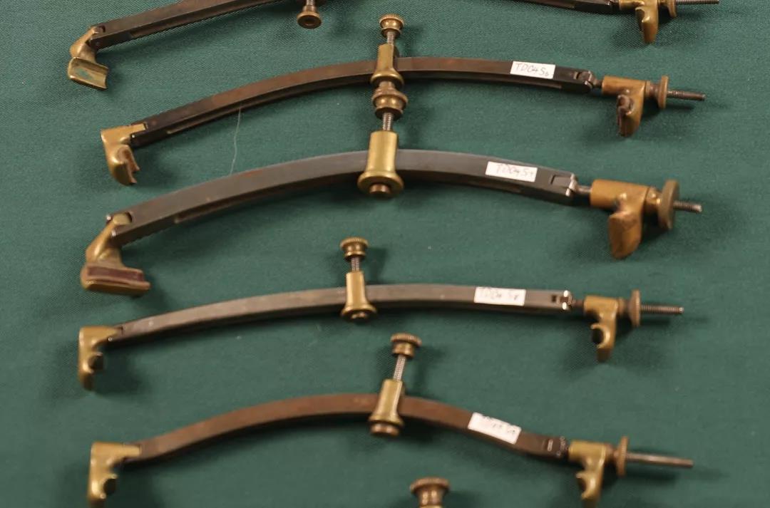 5、约1900年手工制作的带有琴板弧度形状的琴板裂缝修复夹。采用双层钢片结构,万向型铸铜挂钩并配有螺丝微调。双层钢片设计避免了在使用中修复夹与琴板弧度间所产生的位移,设计独特、先进、科学。