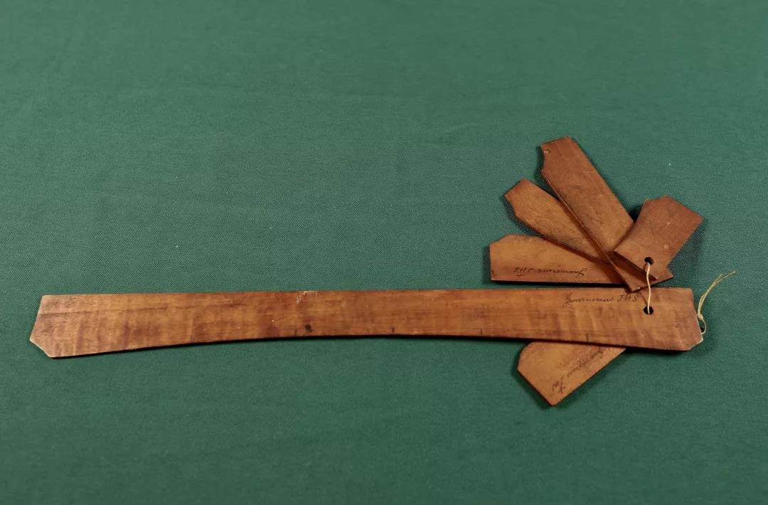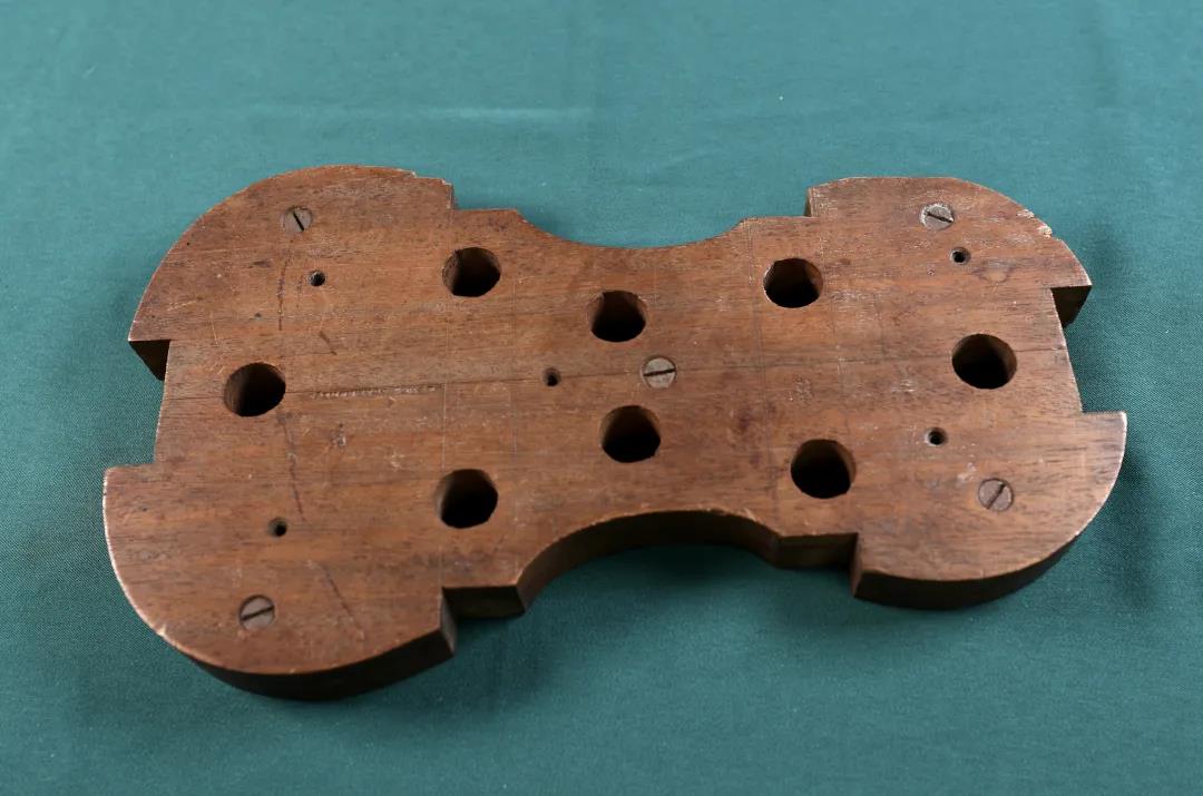 2、Pietro Guarneri 琴型内模具,约1910年制作。第一张图片琴模厚度接近琴箱侧板高度,薄厚双层设计,使用时在侧框粘合结束后,取下薄层随后进行衬条的安装。这种模具厚度设计有别于Stradivari,意在最大限度地控制侧框最终结束时的准确度,还配备侧板角木及端木的所有垫木(第二张图片)。第三张图片为琴板长弧度和横弧度样板尺。