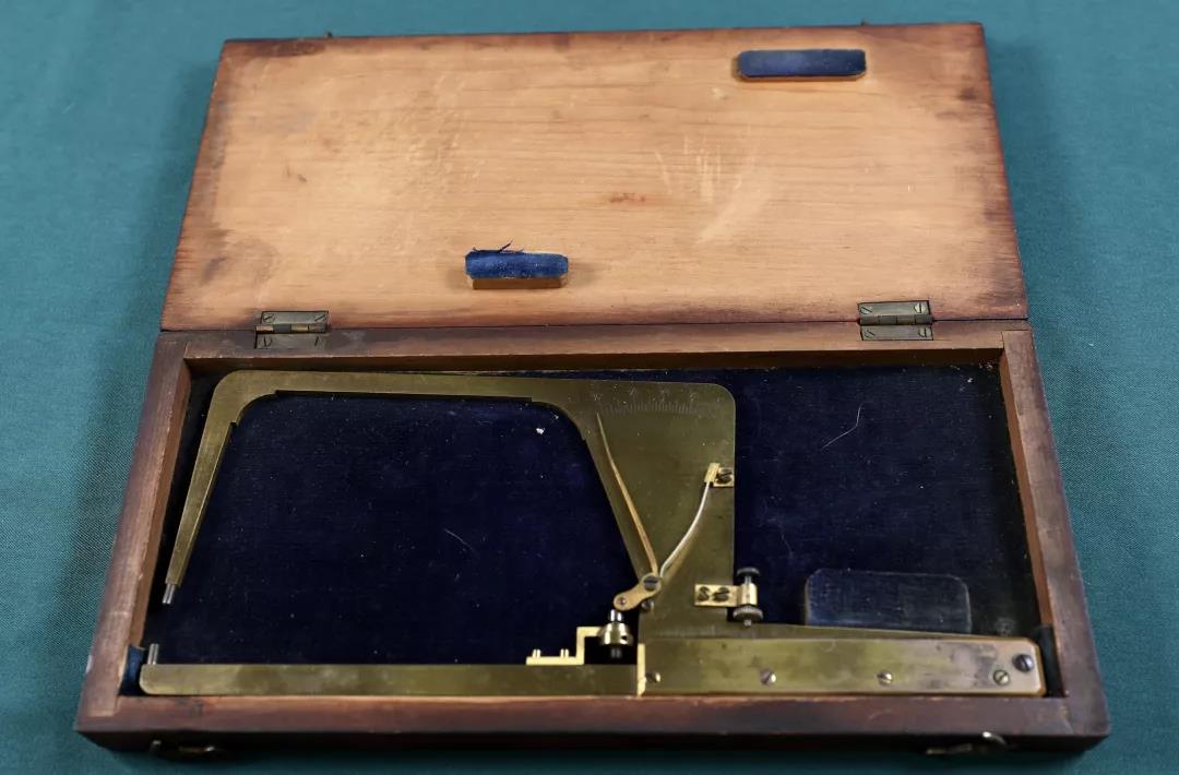 3、英制琴板厚度卡尺。黄铜加弹簧钢材质,手工制作,精度极高的前提下配有微调装置,约1920年出品。使用时只要轻按手柄即可对小提琴的面板、背板进行测量,通常小提琴的面板和背板的最厚和最薄尺寸分别为3.5mm,2.5mm;4.5mm,2.6mm。实用性很强。