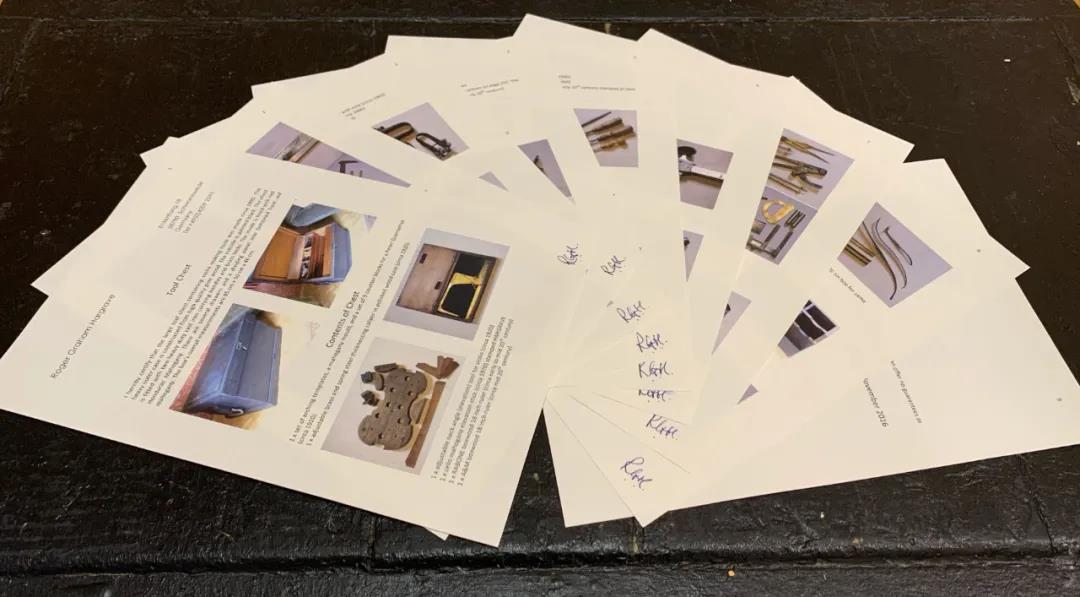 本次捐赠,为欧洲100-300年间的制琴工具,工具品种齐全,数量众多,几乎能够满足儿童提琴以及大中小提琴制作的全部需求,并附有Roger Hargrave先生亲笔签名的鉴定证书。下面就让我们一探捐赠工具中代表作品的传世风采: