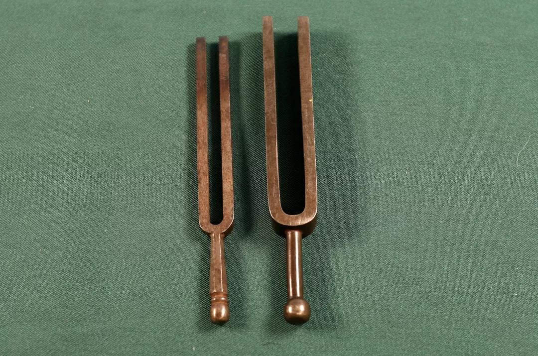 11、2个制作于19世纪的标准音音叉。大的439.5Hz,小的433Hz。由于在19世纪早期各国标准音的设定各有不同,甚至每个歌剧院之间的标准音也都存在差异,于是在1859年2月16日法国政府通过一项法案将中央C上的A设定为435Hz。
