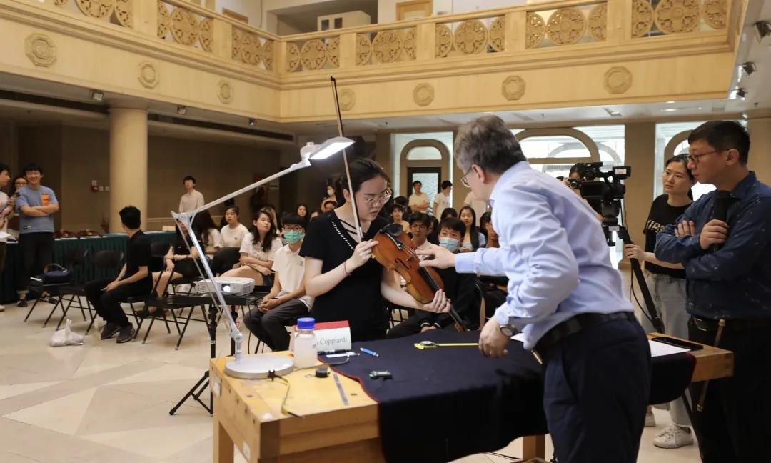 6月18日午时,音乐学院的学子们,从四面八方,沿着熠熠发光的“地标”涌入精致华美的琴房楼友谊厅,参加了这场活动。活动邀请了意大利著名提琴制作大师Marco Coppiardi加入测评,中心副主任高彤彤教授领衔主持,青年党员教师逯翔支持协助,提琴制作研究中心的青年学生们全程参与——师生们共同完成了面向管弦系师生的提琴测评与恢复的公益工作。指板变形、指板凹陷、琴码变形、琴体脱胶、漆面受损……活动中,演奏家们没有发现的问题被一一指出,我们动用了专业工具,如同外科医生一样解决了每把提琴的问题——有些时候,演奏家们以为是自己的问题,但是制琴师们却可能看出是提琴的问题。四两拨千斤的小小调整,就能够令你的提琴音色焕然一新——提琴制作,为提琴注入灵魂与生命,令音乐演奏锦上添花,拥有吸引演奏家们的神奇魅力。
