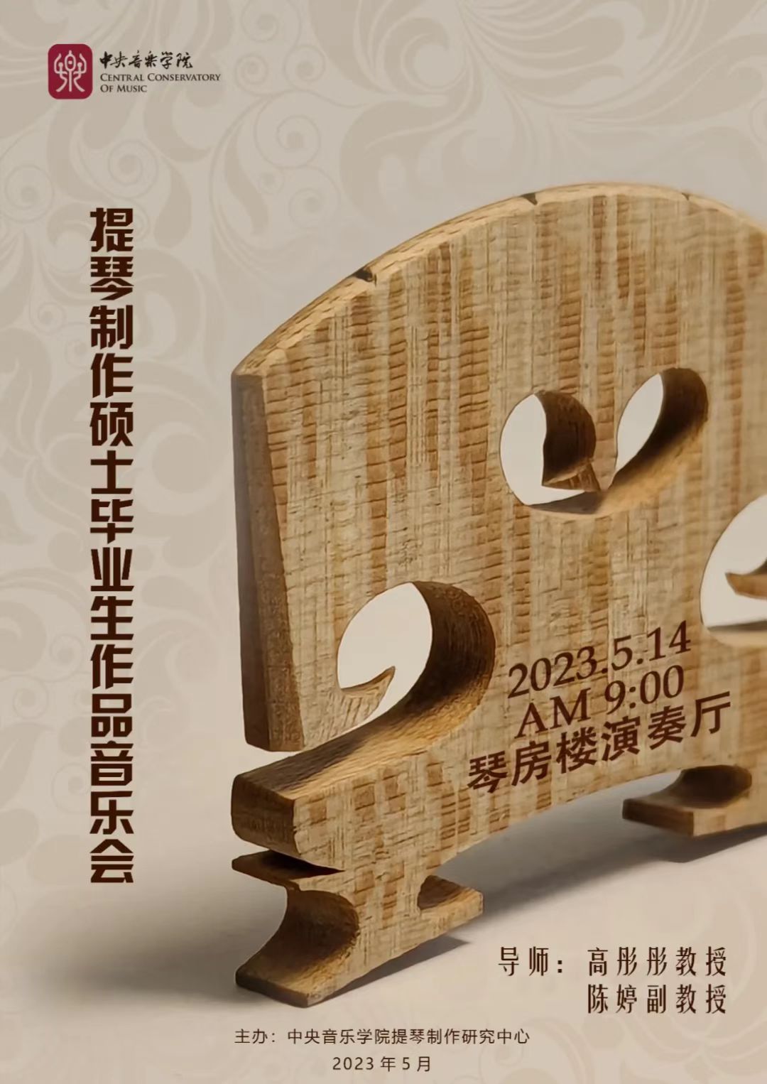 2023年5月14日上午9:00,AC米兰中文官网提琴制作研究中心四位硕士毕业生的提琴四重奏作品音乐会将于琴房楼演奏厅精彩上演。