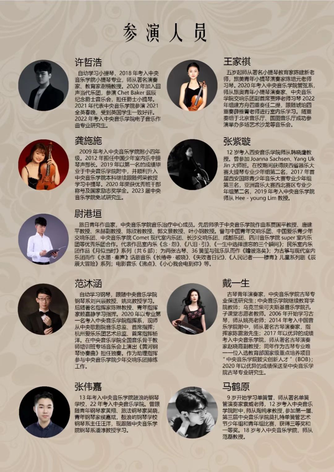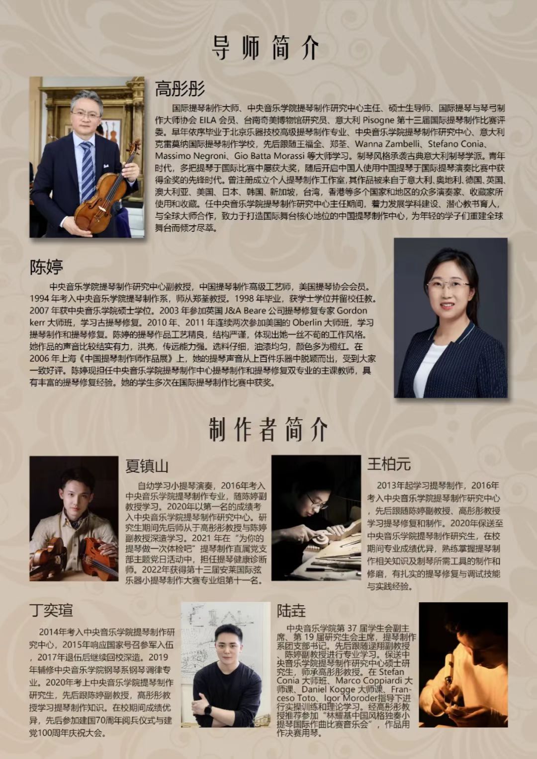 此种形式的四重奏套曲音乐会为提琴制作研究中心首次举办。四位毕业生的导师分别为高彤彤教授和陈婷副教授。
