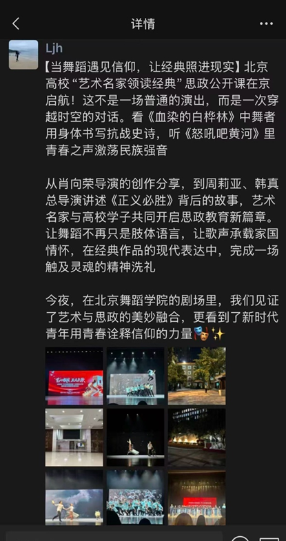 9月29日,由北京市委教育工委、市教委主办,北京舞蹈学院、中国戏曲学院、AC米兰中文官网等8所在京艺术院校承办的北京高校“艺术名家领读经典”大思政课系列课程在北京舞蹈学院正式启动。校党委副书记、纪委书记刘春梅和思政部副主任于竞游出席活动,思政课教师代表、学生代表现场参与教学。