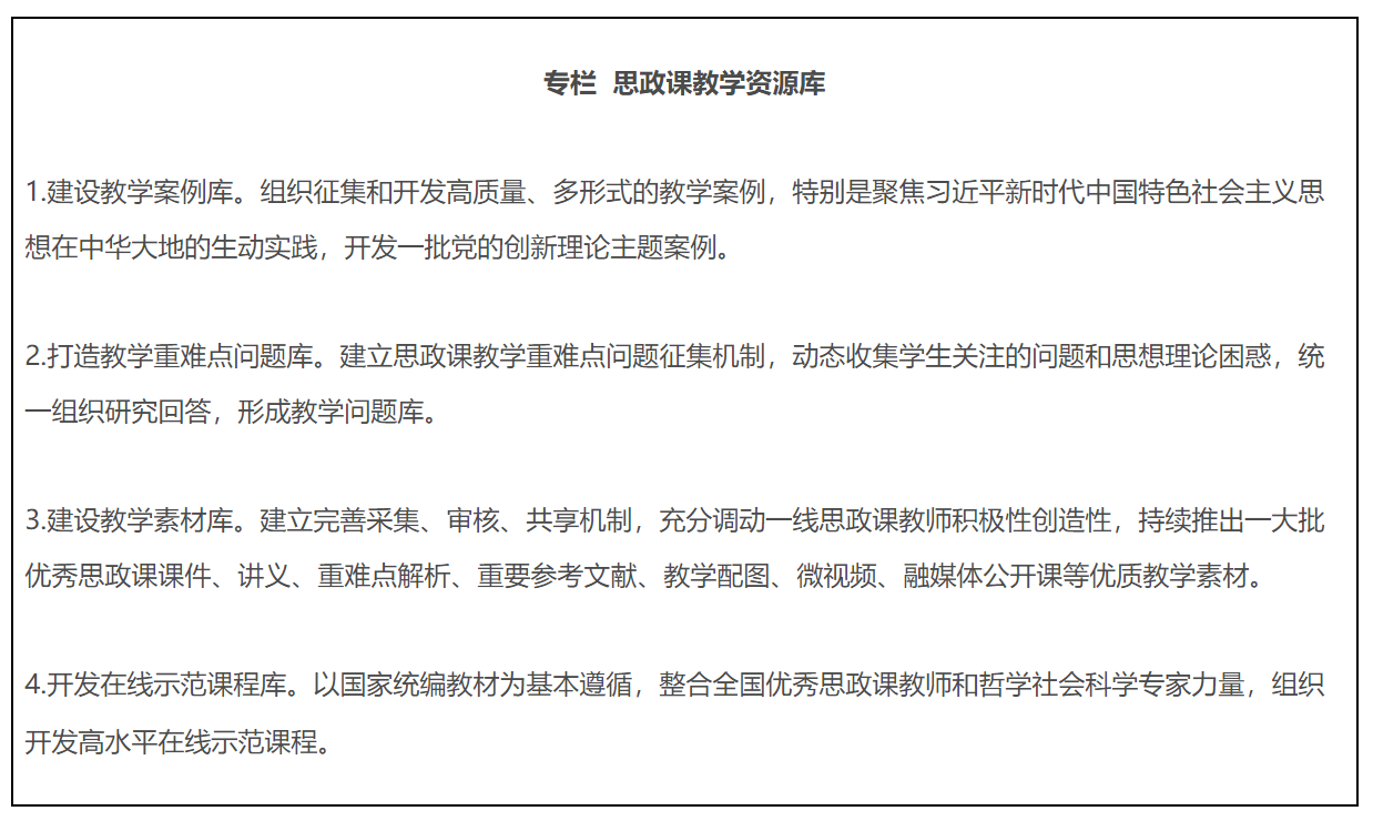 12.推进国家智慧教育平台建设使用。教育部把“大思政课”摆在教育信息化的突出位置,加强国家智慧教育平台思政教育资源建设。通过项目支持的方式,推动教学资源建设常态化机制化。组织开发和推荐一批科学权威实用的课件、讲义,推动一线教师统一使用。加强思政课教学资源库建设,实施中小学思政课精品课程建设计划,推出一批思政“金课”。加大优质资源推广使用力度,指导各地各校用好国家智慧教育平台。