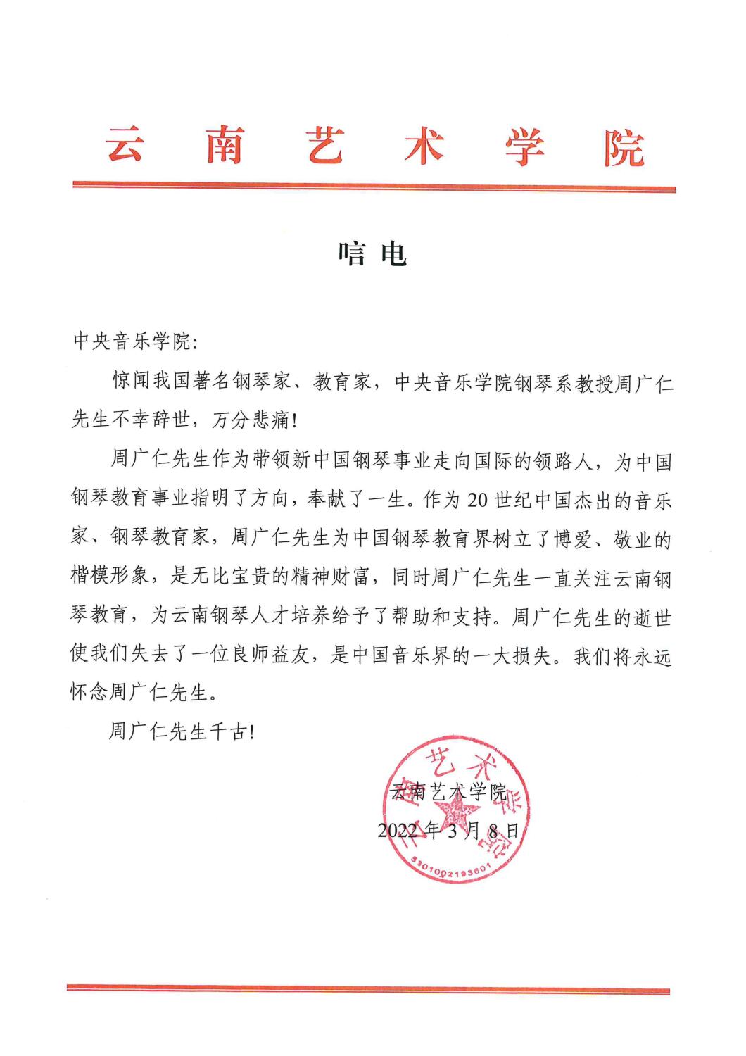 云南艺术学院致唁电 悼念周广仁先生