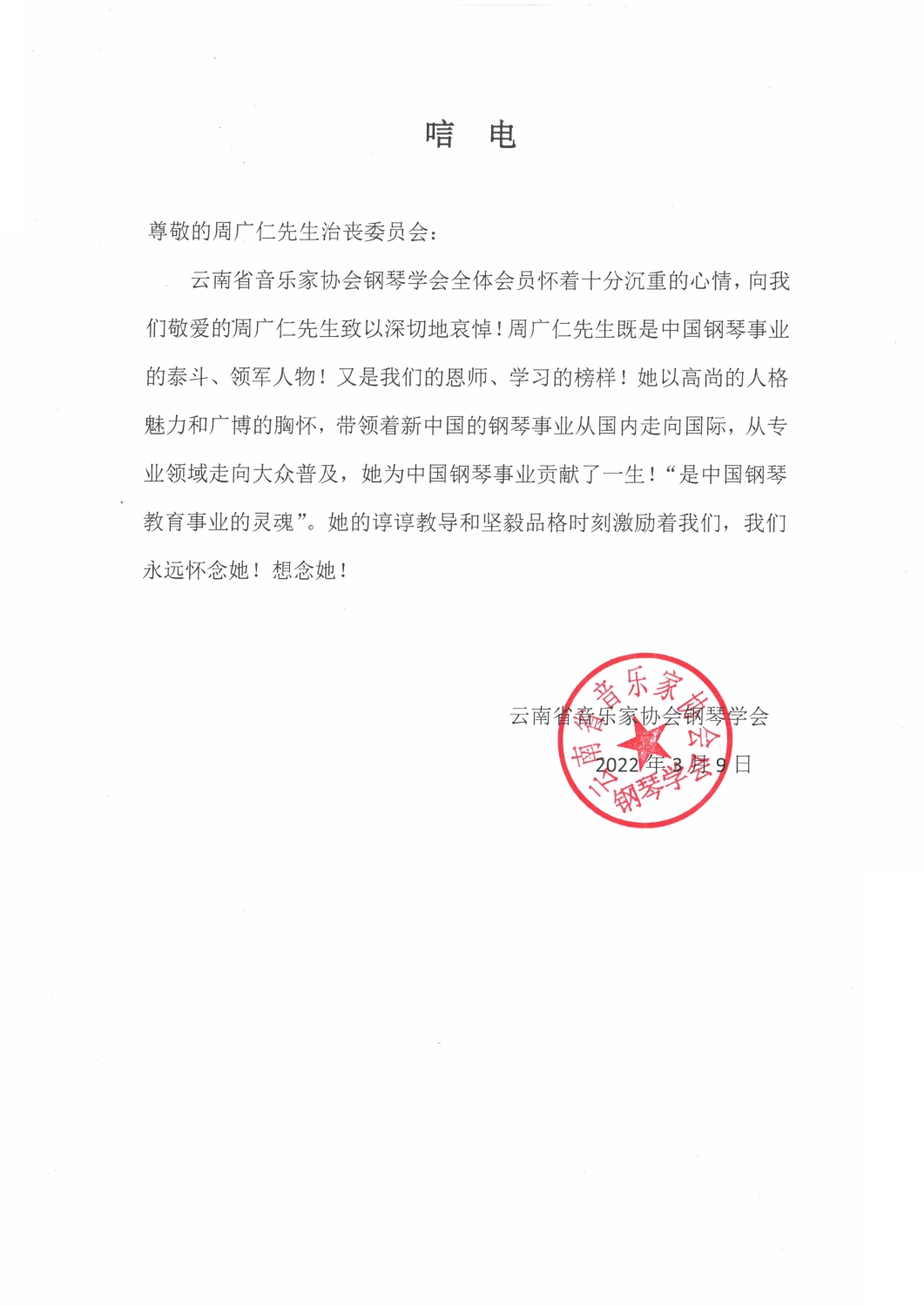 云南省音协钢琴学会致唁电 悼念周广仁先生