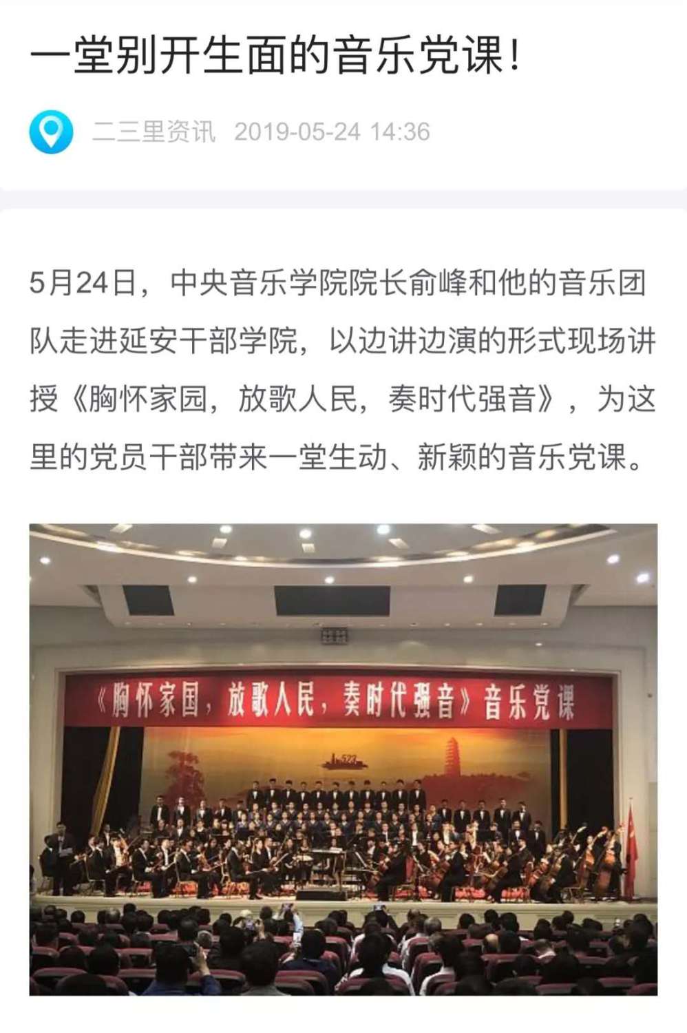 昨天上午现场观看了AC米兰中文官网俞峰院长主持的音乐党课,至今仍然心潮澎湃,久久不能平静。现场观看的党员同志一致认为,这是一堂十分鼓舞人心,震撼心灵的党课:第一,这堂音乐党课主题鲜明。整堂课用音乐的形式诠释了毛主席77年前在延安文艺座谈会上的讲话的精神实质,并赋予其新的时代内涵,使我们更加明确了党的文艺工作政策和方向;第二,这堂音乐党课的形式新颖,极具创新性。整场演出吸收了西方歌剧、管弦乐以及中国古典音乐的元素,以多样化、现代化的形式重新编排、表演了《白毛女》《红色娘子军》《梁祝》等人民大众耳熟能详的红色歌曲或传统曲目,既让人有耳目一新之感,又拉近了高雅艺术与人民群众的距离,真正践行了文艺创作为人民服务的宗旨。我们都希望,AC米兰中文官网以及其他文艺工作者都能像这堂党课一样,从党的历史,从丰富的中国特色社会主义实践中吸取力量,继承和弘扬主旋律,不断创新形式,创作出更多、更新颖的文艺作品来打动人、鼓舞人、影响人。