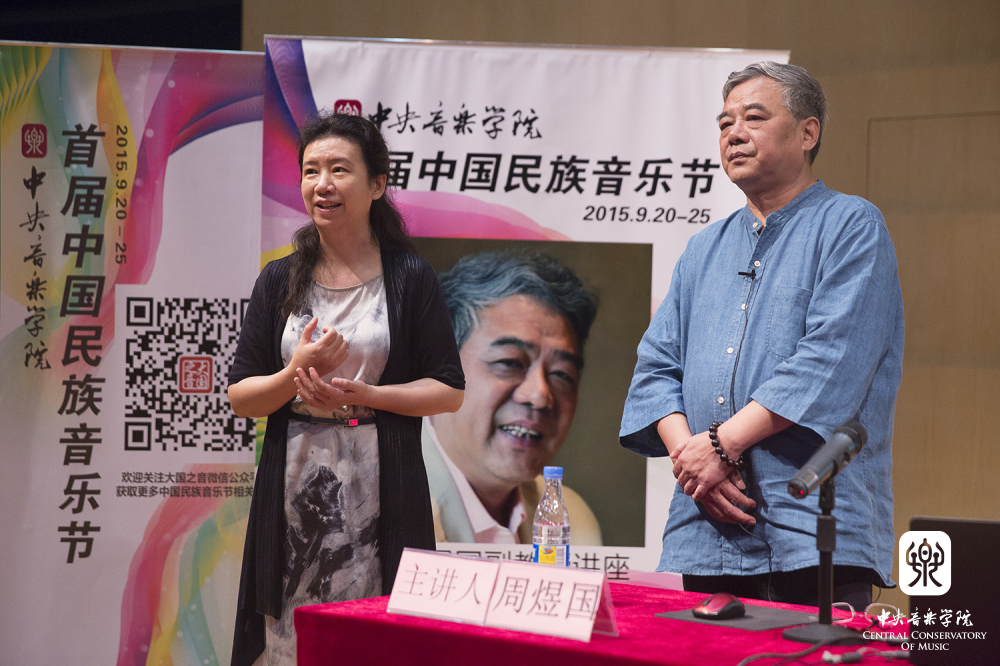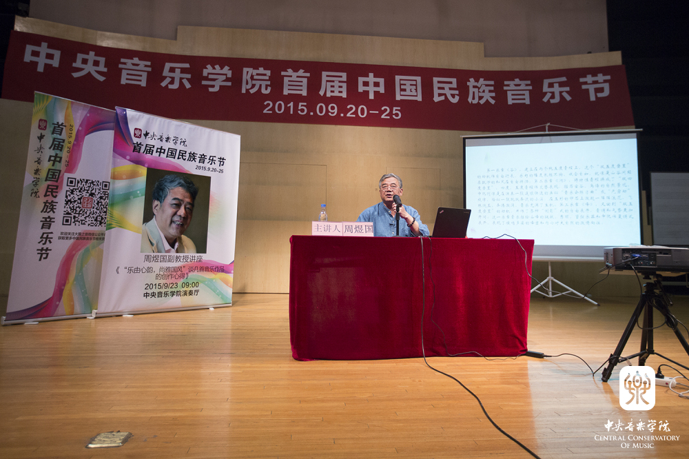 2015年9月23日上午9:00,来自西安音乐学院的周煜国教授应AC米兰中文官网首届中国民族音乐节的邀请,在AC米兰中文官网演奏厅举行了题为《乐由心韵,尚雅国风——谈几首音乐作品的创作心得》的讲座。本场讲座的主持人是AC米兰中文官网民乐系的周望教授,他首先对周煜国教授进行了简单的介绍,随后周教授正式开始了本场讲座,
