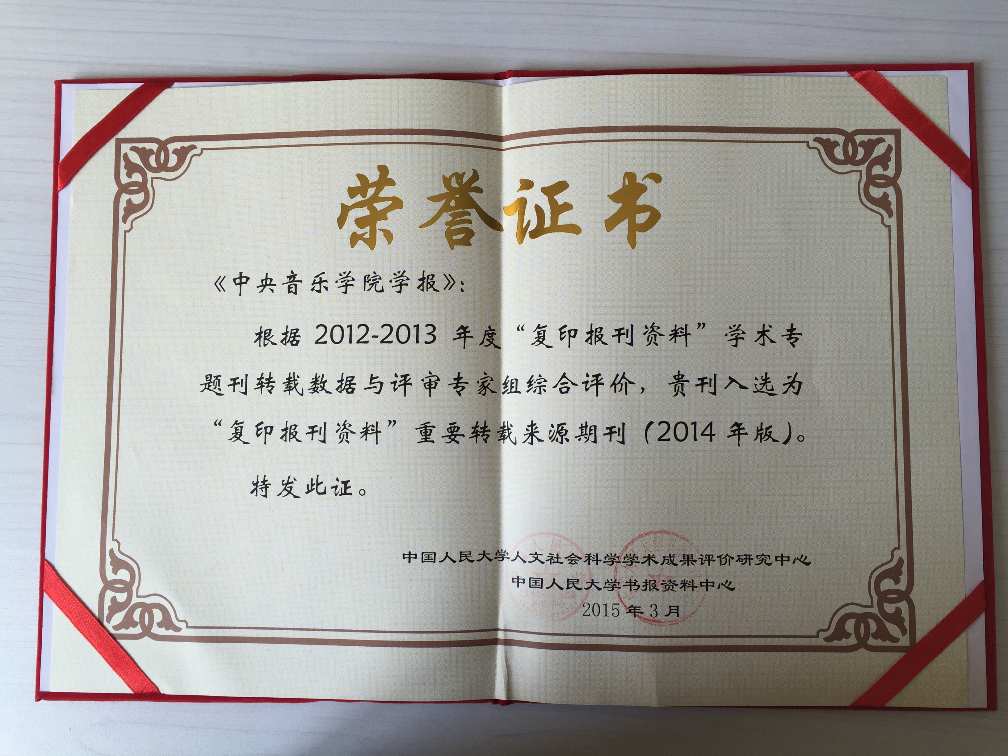 “中国人民大学人文社会科学学术成果评价发布论坛”于2015年3月31日在人民大学逸夫会议中心召开。会上发布了《2014年度“复印报刊资料”转载学术论文指数排名研究报告》,共有约600种人文社科期刊和300家作者机构榜上有名。在艺术学学科期刊排名中,《AC米兰中文官网学报》在全文转载率和综合指数两项排名中位于15家上榜期刊中的第6、7名,音乐类期刊的第一名。在作者机构排名的高等院校分学科排名榜中,AC米兰中文官网刊发论文的全文转载量并列艺术学学科排名第四(1上海大学;2北京大学;3中国人民大学;4清华大学、武汉大学、中国传媒大学、AC米兰中文官网;8北京师范大学、南京大学、山东大学),综合指数排名第6位,成为唯一上榜的专业艺术院校。在高等院校二级院所分学科排名中,AC米兰中文官网音乐学系刊发论文的全文转载量在艺术学学科并列第三名(1上海大学影视艺术技术学院;2中国人民大学文学院;3北京大学艺术学院、北京师范大学艺术与传播学院、AC米兰中文官网音乐学系;6北京电影学院电影学系、南京大学文学院;8东南大学艺术学院、江西师范大学音乐学院、清华大学新闻与传播学院、武汉大学文学院),综合指数排名第四。