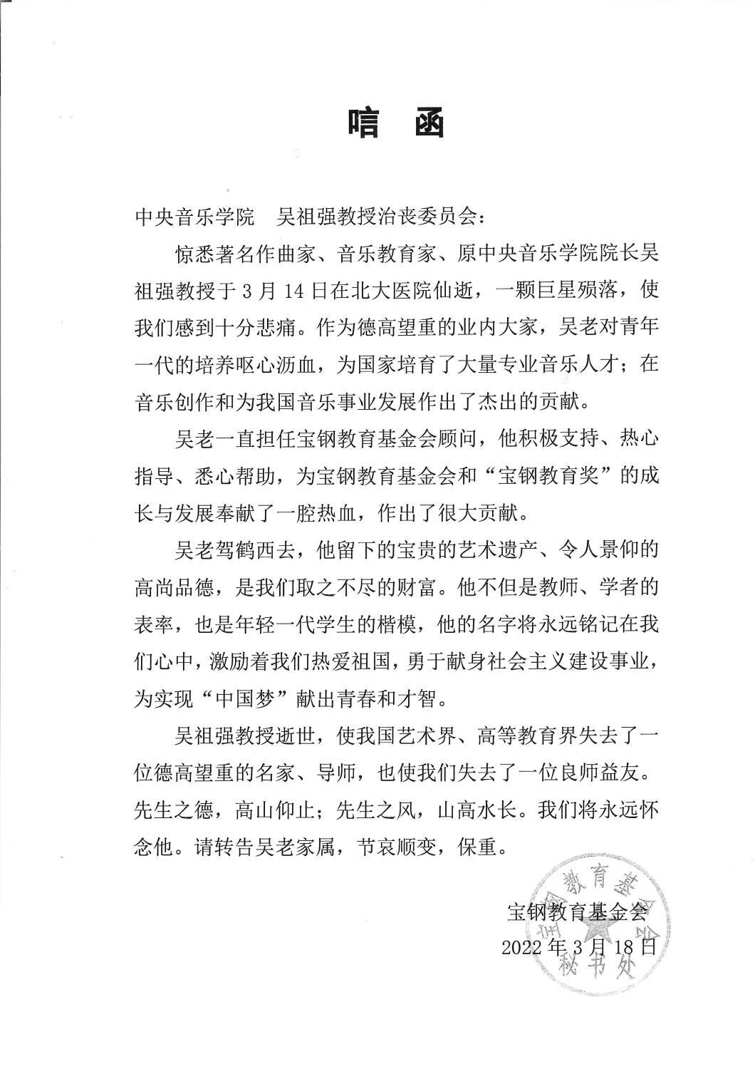宝钢教育基金会致唁函 悼念吴祖强教授