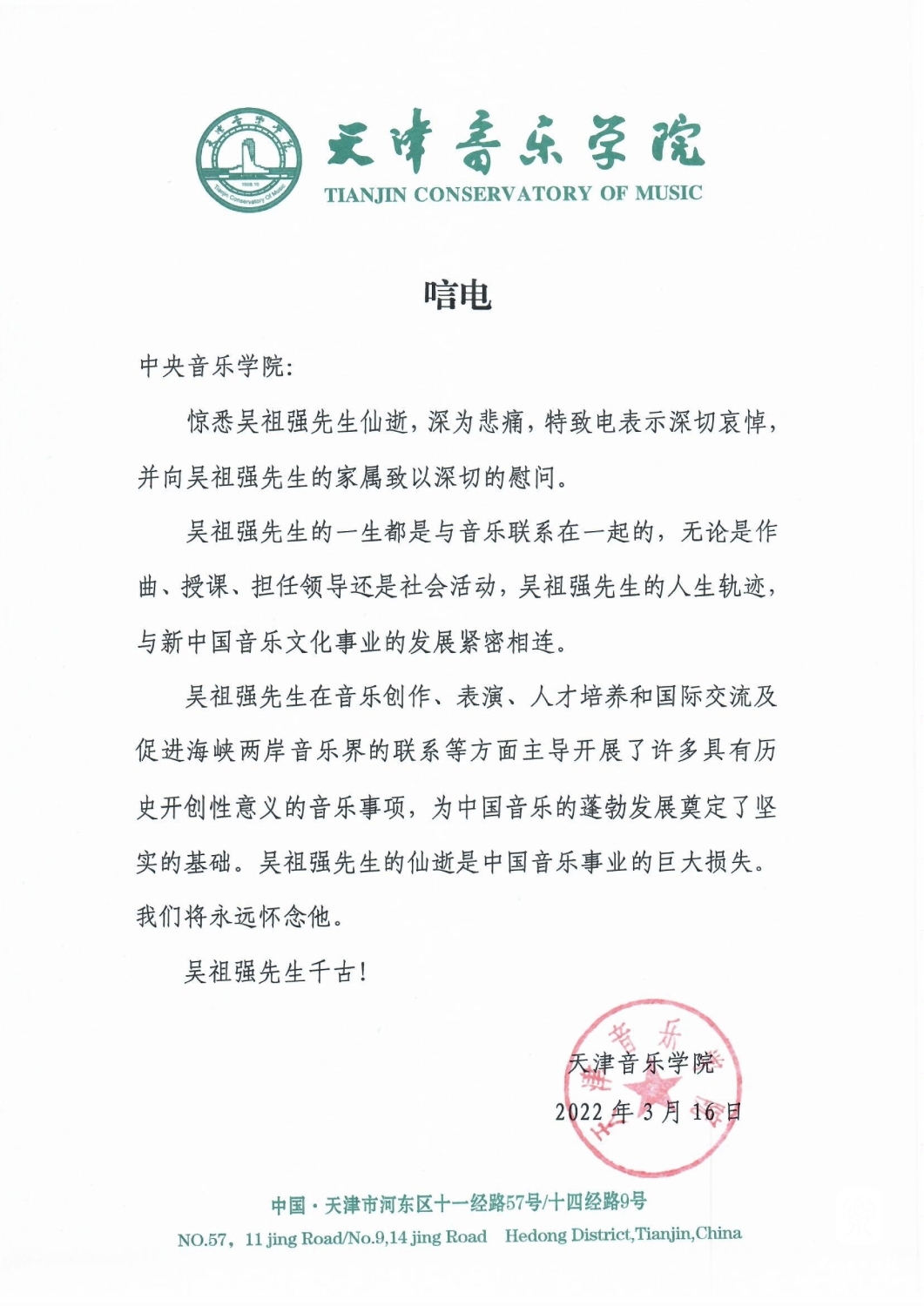 天津音乐学院致唁电 悼念吴祖强教授