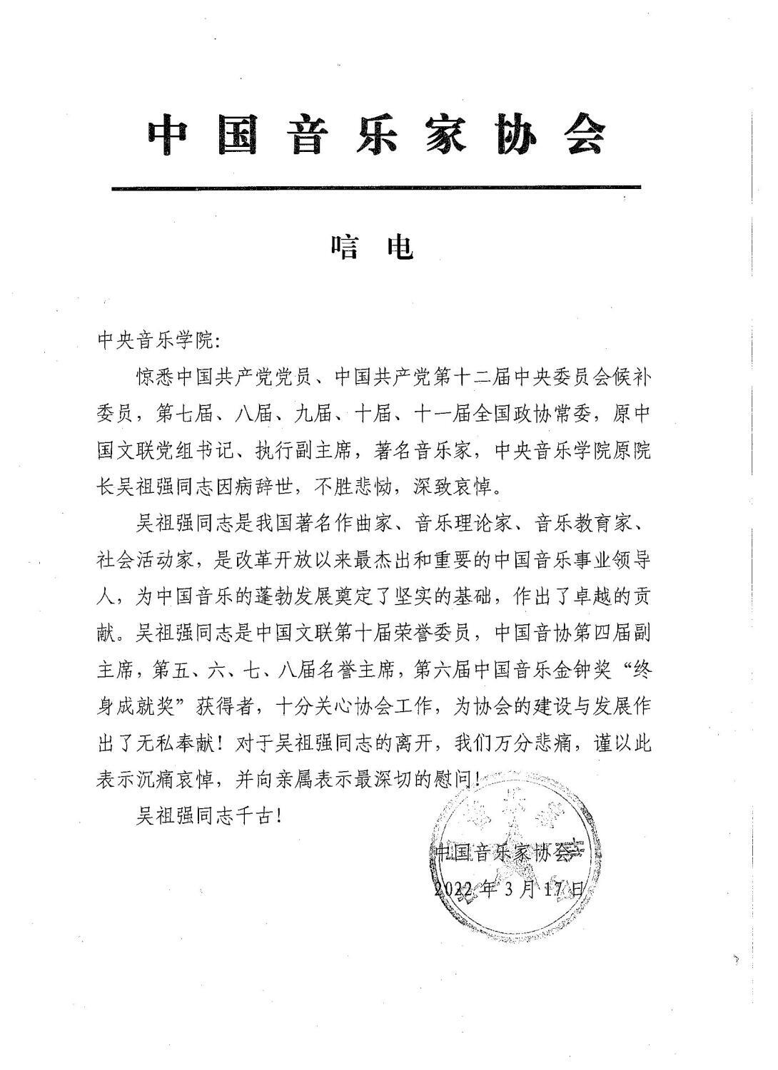 下一条:中国音乐家协会作曲与作曲理论学会致唁电 悼念吴祖强教授