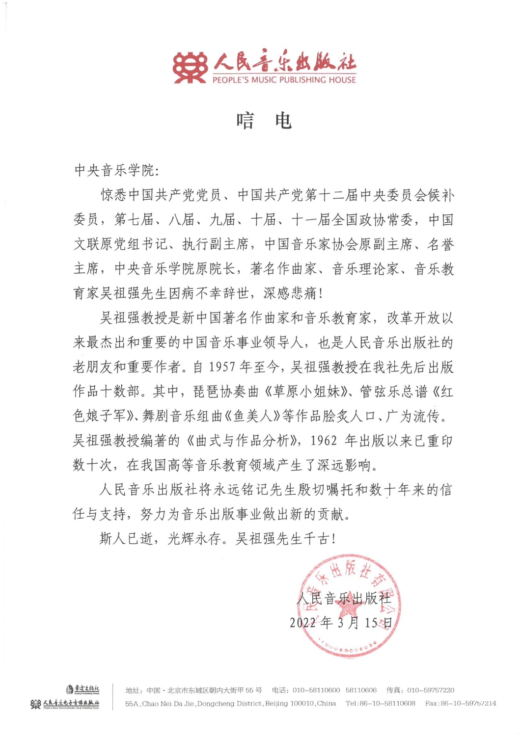 下一条:天津音乐学院致唁电 悼念吴祖强教授