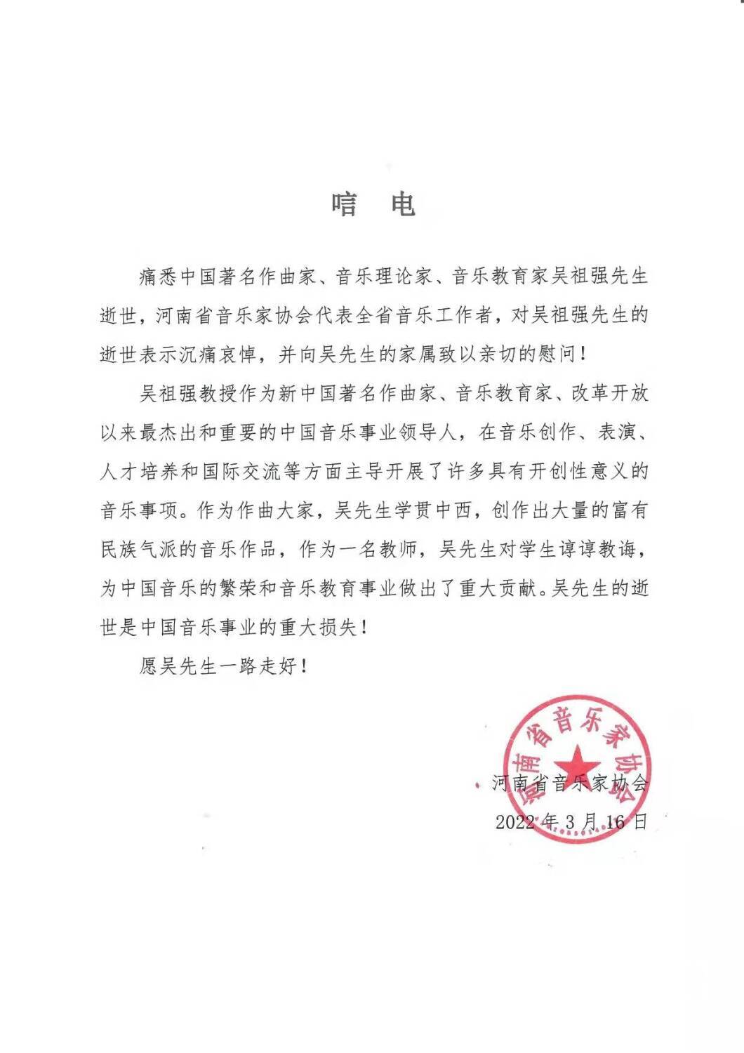 河南省音乐家协会致唁电 悼念吴祖强教授