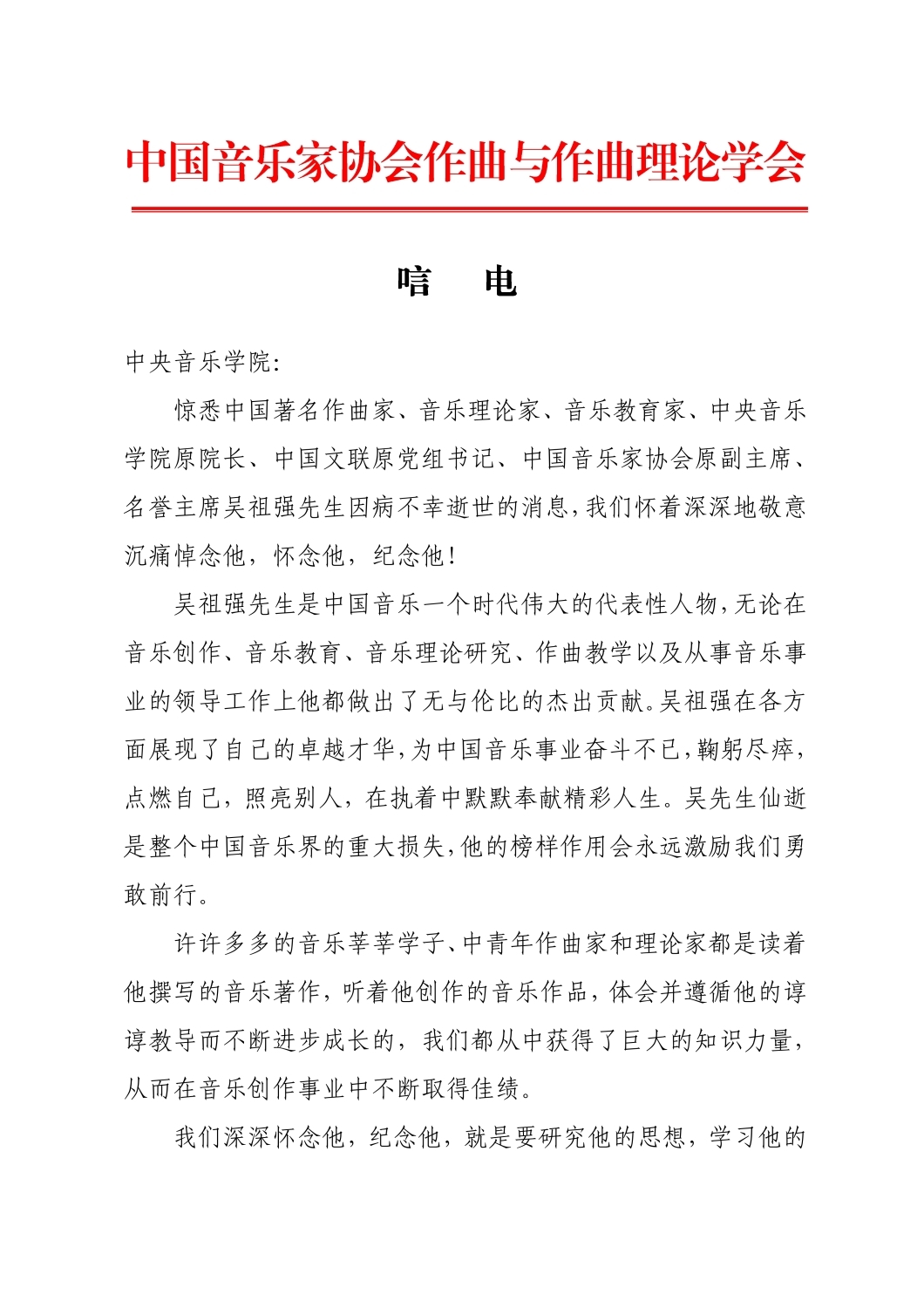 中国音乐家协会作曲与作曲理论学会致唁电 悼念吴祖强教授