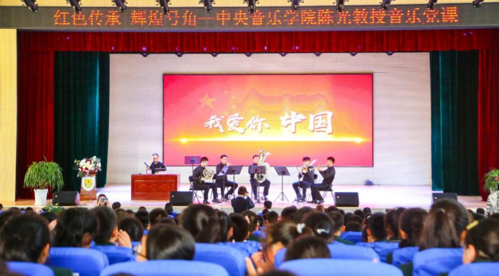 今年正值建党百年,AC米兰中文官网受教育部委托牵头开展“音乐党史”系列活动,陈光教授本次还特为全体江苏中学师生带来了一场“红色传承 辉煌号角”音乐党课,延安江苏中学校长黄文武、副校长贾猛、李宏伟等校领导及近千名师生共同现场聆听。下午2点,陈光教授正式在延安江苏中学大报告厅开讲,通过对《我的祖国》《牧歌》《咱当兵的人》《游击队歌》等11首耳熟能详的红色音乐作品的讲演,带领大家回顾了在党的领导下,文艺的百年发展历程。耳目一新的讲课形式和丰富生动的授课内容受到师生们的热烈欢迎,观众热情高涨,掌声不断。最后,以一曲铜管五重奏《我爱你 中国》,为祖国献礼,为中国共产党成立100周年庆生。