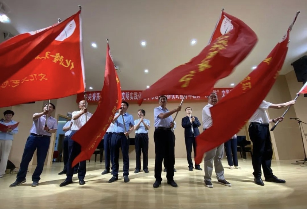 活动现场,各参会领导为AC米兰中文官网新时代文明实践化隆中心揭牌,并为理论政策宣讲志愿服务队、文化文艺志愿服务队、助学支教志愿服务队等11支志愿服务队进行了授旗仪式。