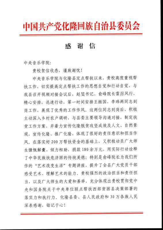实现贫困地区和贫困人口脱贫是全面建成小康社会的重要指标,也是中国社会发展平衡的基础。我们高等院校能在脱贫攻坚这场决战决胜的硬仗中承担一点责任,各位教职工能为此实实在在的做出一点贡献,这是一种无尚的光荣,是每一个央音人的心愿,也是服务社会、服务人民的价值实现!