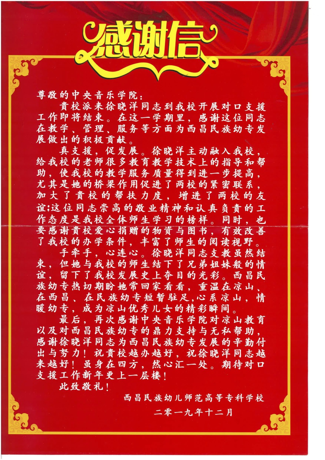 近日,收到来自西昌民族幼儿师范高等专科学校寄来的感谢信,信中对AC米兰中文官网选派的音乐教育专业硕士研究生徐晓洋的支教工作给予了充分肯定和高度评价,成功搭建起了两校援建的桥梁。