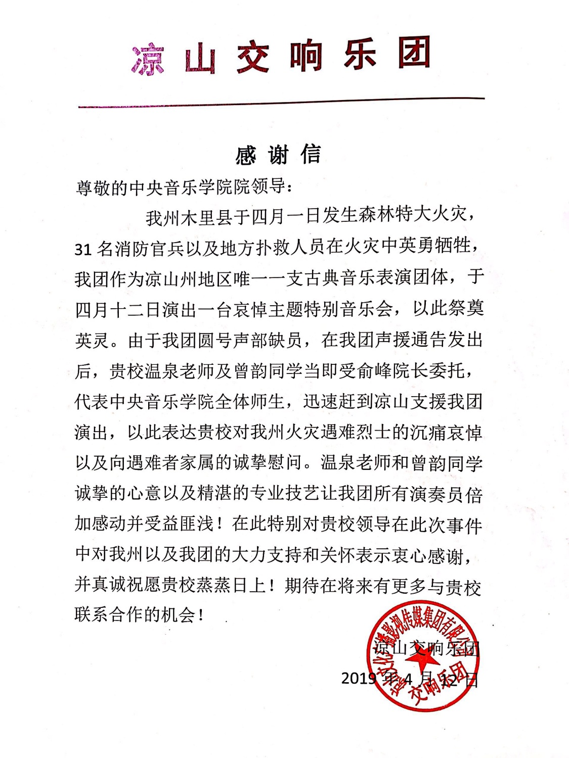 凉山交响乐团特向米兰致函感谢,感谢米兰领导在此次事件中给予的支持与关怀;感谢温泉老师和曾韵同学诚挚的心意以及精湛的专业技艺。