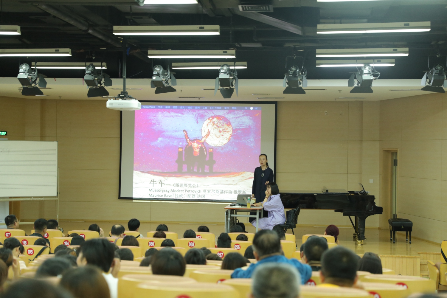 下午,米兰作曲系视唱练耳教研室郝卓亚教授在同一地点开展了“用视唱来练耳”讲座。在讲座的前半部分,她结合丰富的音乐片段,为现场学员细致分析了音乐的五个基本要素,即速度、力度、音高、节奏、音色。在速度与力度方面,她强调乐谱上的每个速度与力度记号都是音乐中至关重要的部分,不同的记号有着细微但截然不同的意义,因此作为一名音乐工作者,应对乐谱上的标注有敏锐的感知;在音高与音色上,音调与音区的高低、音乐的上下行、音色的变化带来的都是不同的情感效果,她启发现场教师最大限度发挥想象力,并以此来引导学生来体验音乐;在节奏上,她展示了不同的记谱所展现出的完全不同的音乐风格,并细致分析了几种常见的节拍类型,让大家对节奏有了更深入的了解。在讲座的后半部分,她以法国作曲家圣-桑的《动物狂欢节》作为示例,带领学员上了一堂生动的视唱练耳课。在课上,她主要引导大家“做”出了音乐的五大要素,使得现场深刻感受到这些要素是如何有机而合理地组合在一起,并且营造出了何种美妙的效果。整场讲座,郝卓亚教授始终从“要听什么”、“怎么听”、“如何建议别人听”这几个角度来引导现场学员,并强调学员教师们以后授课时可以从多角度启发、提问学生。讲座圆满举行,令在座的200位教师受益匪浅。