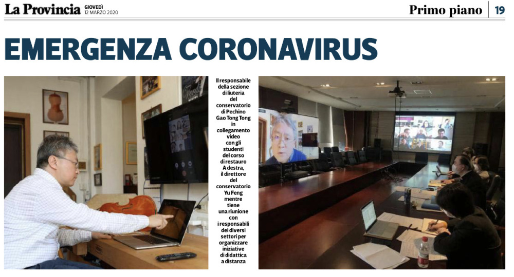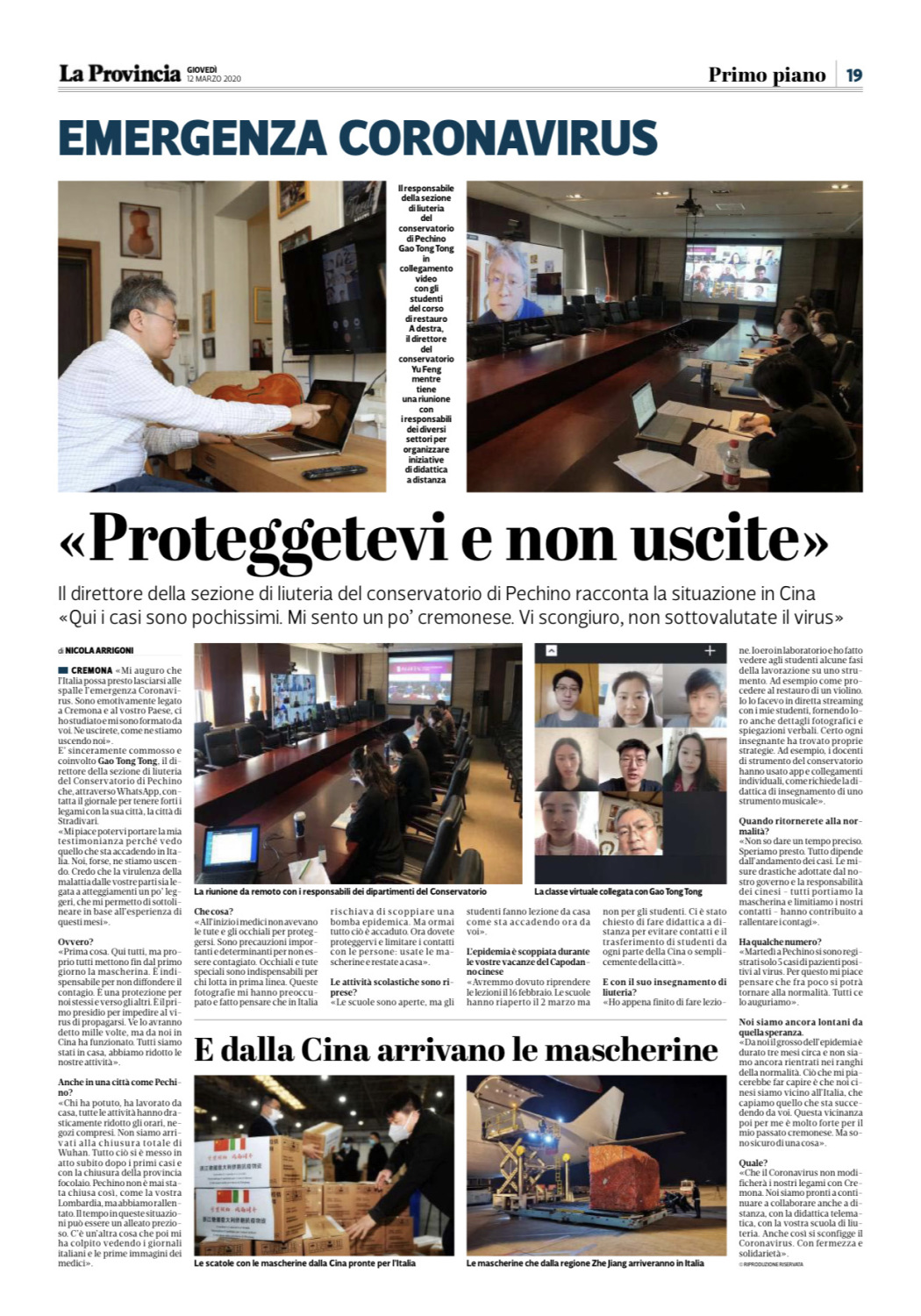 近日,在中国新冠病毒疫情防控形势渐趋平稳的时刻,来自世界疫情重灾区的意大利克雷莫纳当地报纸,连线采访了米兰提琴制作研究中心副主任高彤彤教授,并以“保护好自己不要外出”为新闻标题刊登了采访内容,向意大利当地人民介绍了中国先进而有效的抗疫经验。采访中,意大利记者了解了中国目前疫情的发展状况,并询问了高老师本人对意大利当前疫情的看法与建议,同时还特别取经米兰“停课不停学”的具体做法。