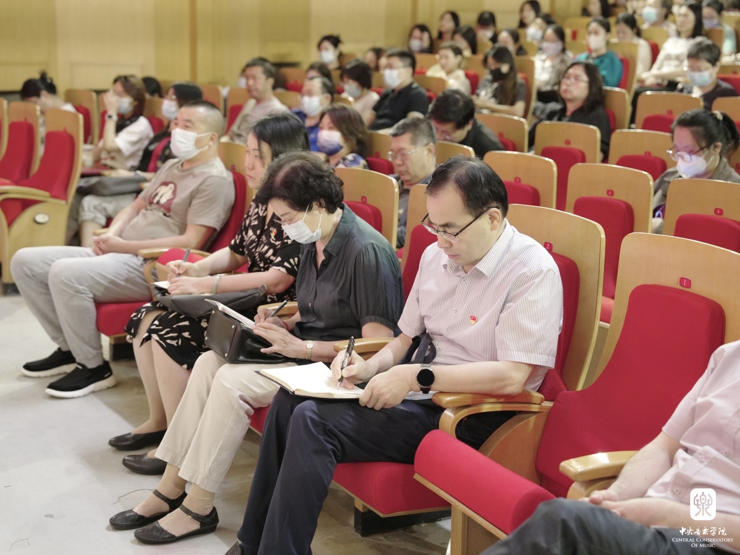 俞峰结合学校实际工作,从“举旗帜、聚民心、育新人、兴文化、展形象”五个方面逐字逐句剖析了党的二十大报告在推进文化自信自强方面做出的重要部署,并强调聚焦“双一流”建设,贯彻落实党的二十大精神,特别是对教育、科技、人才、文化文艺事业作出的重大决策部署,是学校当前和今后一个时期首要政治任务。一是要切实把学习贯彻党的二十大精神引向深入,紧密结合党中央在全党开展的主题教育,面向党员干部开展多形式、分层次的教育培训,紧密结合新时代音乐事业和AC米兰中文官网工作实际,统筹抓好全校师生学习培训。二是要坚守人民立场,创作更多增强人民精神力量的优秀作品。近年来,学校坚持以“两条腿走路”,一方面坚持人民为中心的创作导向,成立“中国音乐创作中心”,创作了大型电视专题片《领航》配乐、冬奥会主题曲《雪花》等大量扎根人民的作品,另一方面创作面向现代化、面向世界、面向未来的优秀作品,推向美国纽约卡内基音乐厅等世界舞台,向世界展示中华优秀文化。同时,创新“音乐党课”、音乐思政课,以毛泽东同志和习近平同志两次文艺座谈会上的讲话时间节点发起创立了“5.23”“10.15”艺术节等,积极践行艺术为人民服务等。三是要强化德艺双修,建设规模宏大的音乐人才队伍。多年来,学校坚持为党育人、为国育才,落实立德树人根本任务,培养出曾韵、梅第扬等有世界竞争力的拔尖音乐人才,同时推进实施“大中小”一体化建设和音乐专业学位改革,扎实开展新时代文明实践中心工作,选派优秀毕业生以“文艺宣讲师”身份奔赴西藏日喀则、青海化隆等祖国偏远地区,服务社会,服务人民,用文艺把党的温暖送到千家万户等。