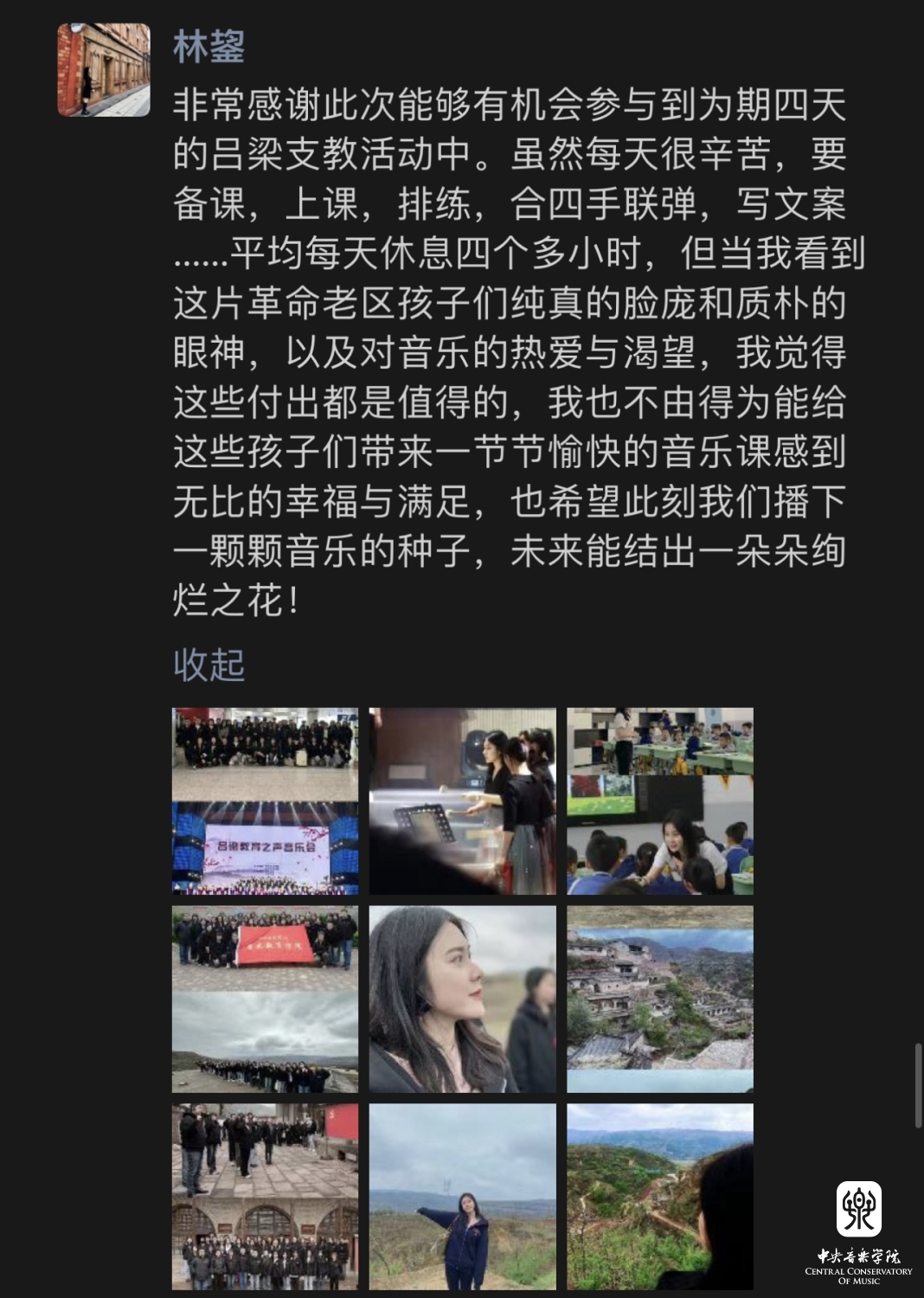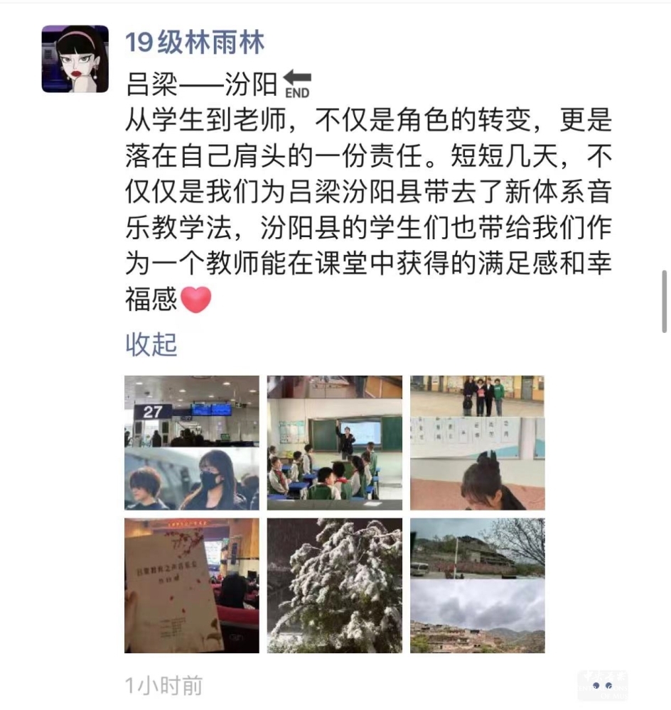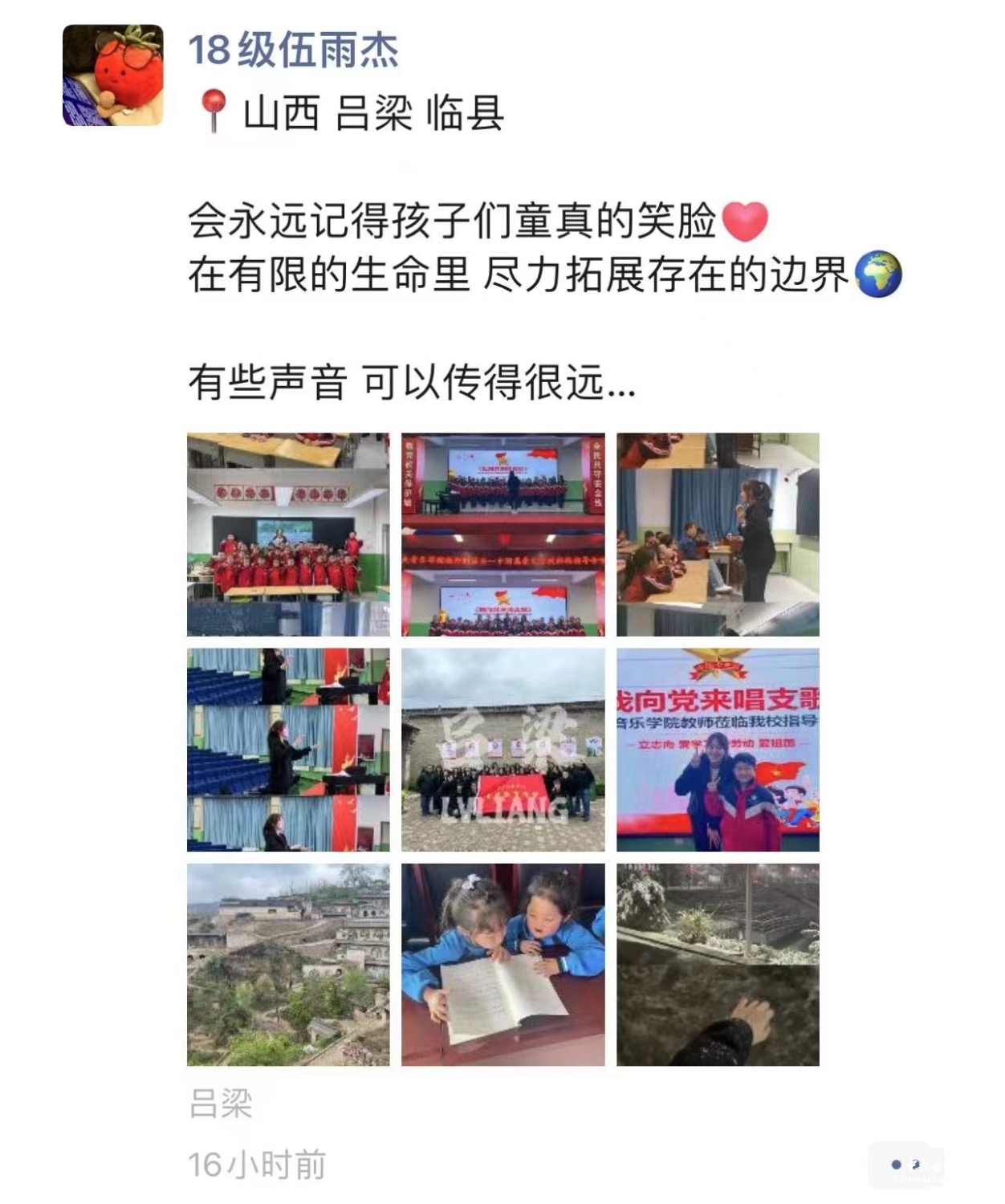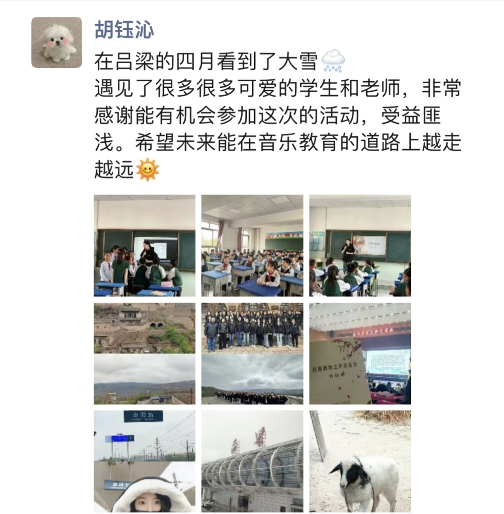 从19日的凌晨出发,到23日返京,米兰音乐教育学院的师生将热情带到了吕梁这片红色热土,师生们为走过的每一个地方带去了音乐的美好,带来了美育教育的力量,也燃起了孩子们的希望。47位师生用自己的力量践行着“音乐振兴乡村 艺术服务人民”的理念,真切的用一节节生动的课堂肩负起作为一名教育工作者的使命,同时将祖国各地的孩子们对艺术、对教育的渴望和热爱注入到我们未来的教学和学习中,让心中“让音乐属于每一个中国人”的种子茁壮成长。