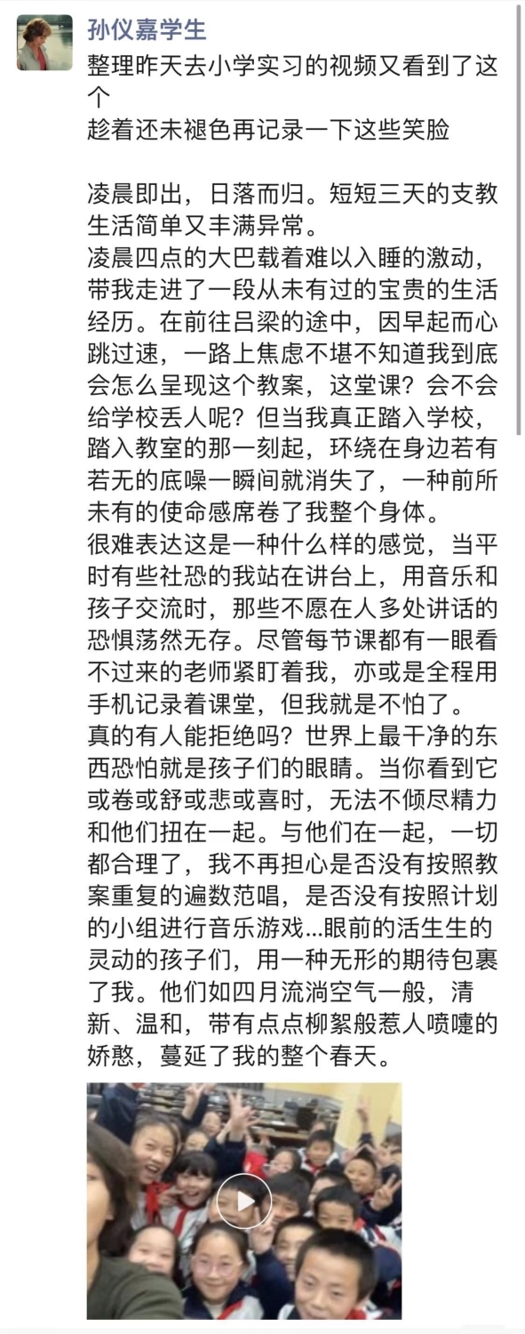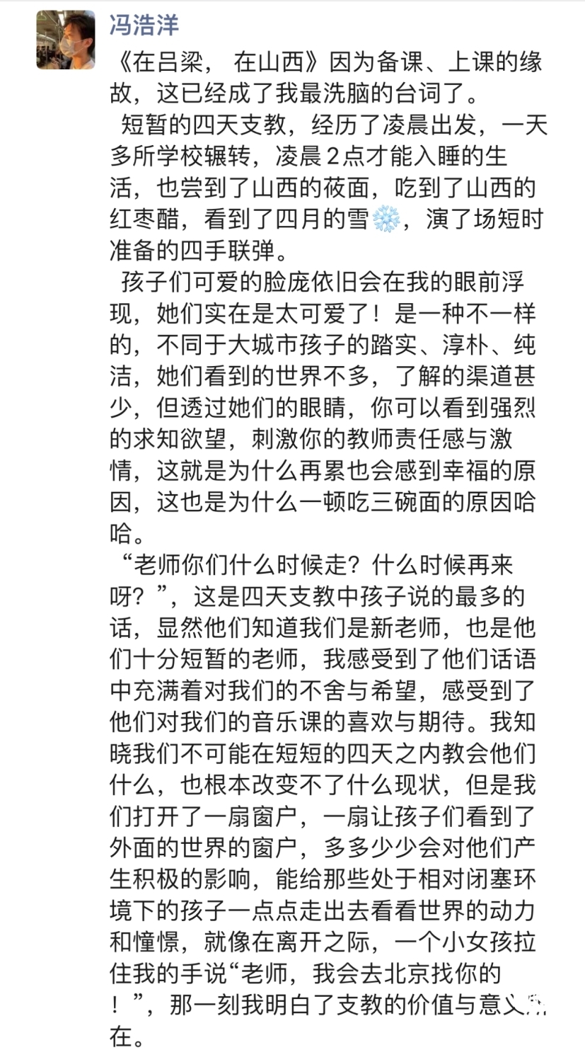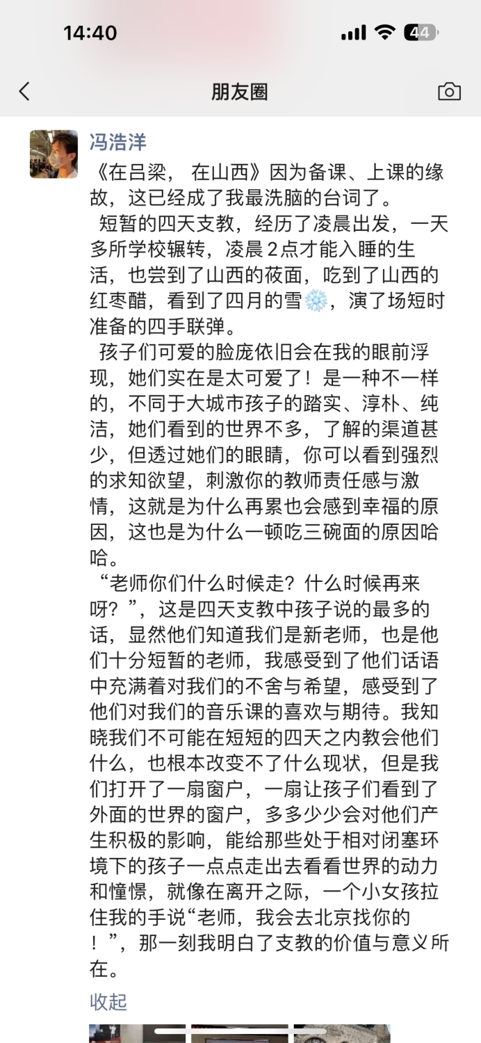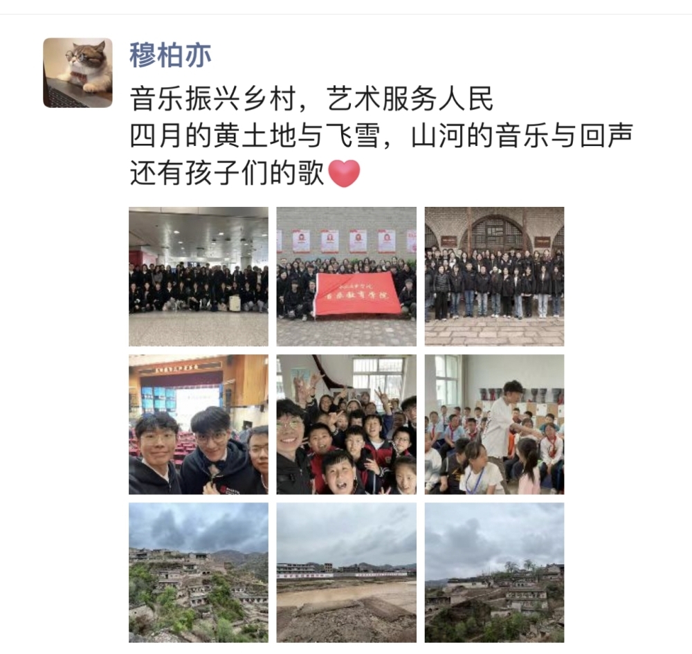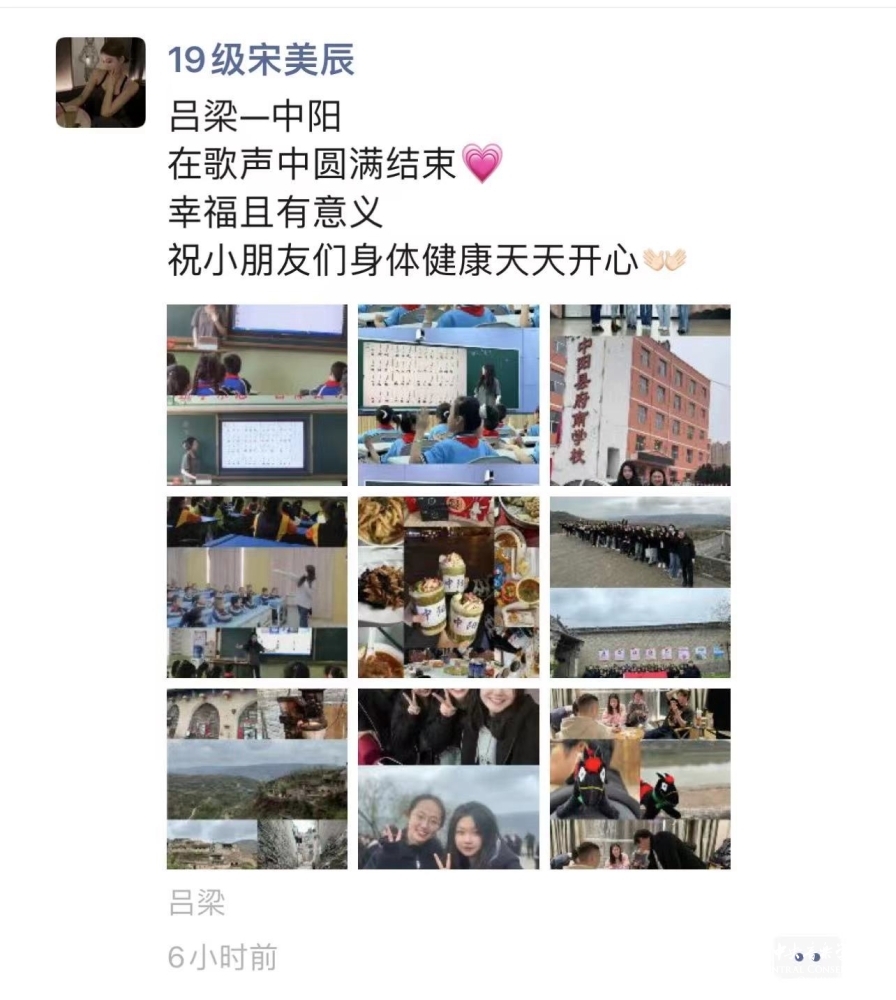 从19日的凌晨出发,到23日返京,米兰音乐教育学院的师生将热情带到了吕梁这片红色热土,师生们为走过的每一个地方带去了音乐的美好,带来了美育教育的力量,也燃起了孩子们的希望。47位师生用自己的力量践行着“音乐振兴乡村 艺术服务人民”的理念,真切的用一节节生动的课堂肩负起作为一名教育工作者的使命,同时将祖国各地的孩子们对艺术、对教育的渴望和热爱注入到我们未来的教学和学习中,让心中“让音乐属于每一个中国人”的种子茁壮成长。