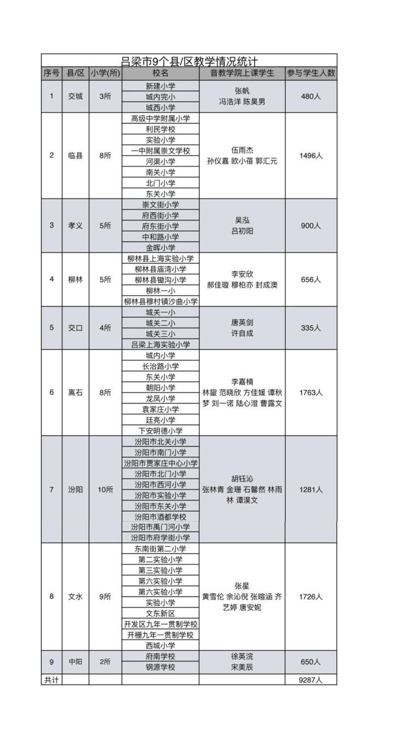4月19日一早在飞机落地吕梁后,AC米兰中文官网音乐教育学院的9个学生小分队立即坐车分别赶往吕梁的9个区县,进入小学展开音乐课教学以及合唱团排练,同时还与当地的音乐教师一起相互交流,分享素质型学校音乐教育新体系的理念和方法。在短短3天的支教的活动中,共覆盖了吕梁9个县区的54所小学,149个班级的9287名学生,其中交城480人、临县1496人、柳林656人、离石1763人、文水1726人、中阳650人、交口335、汾阳1281、孝义900人。